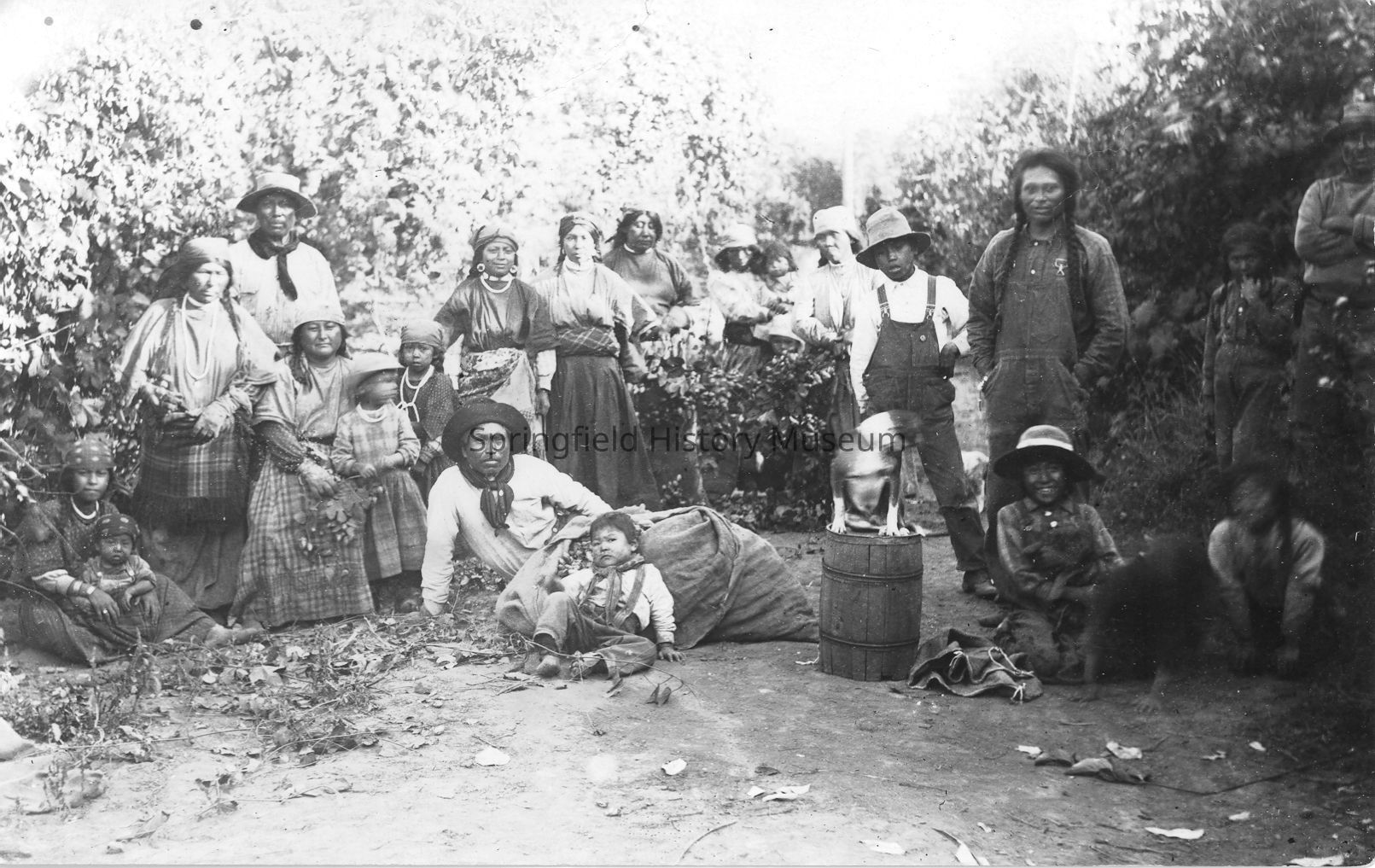 Photograph of Native Americans picking hops, Seaveys Hop Yards, 1914. Twenty-one men, women, children and 2 dogs posing for photo in the hop fields.Photograph Details