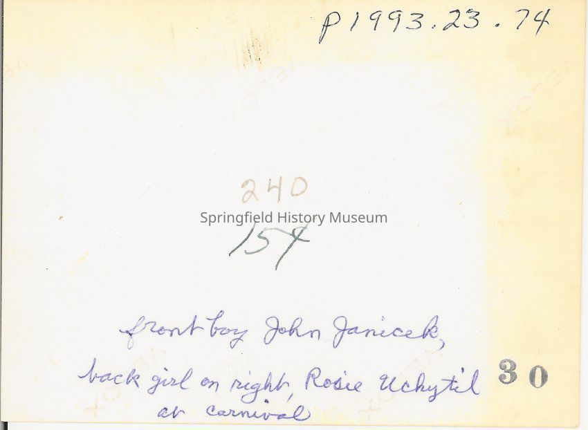Transcribed inscription on back: "Front boy John Janicek, back girl on right Rosie Uchytil at Carnival"Photograph Details