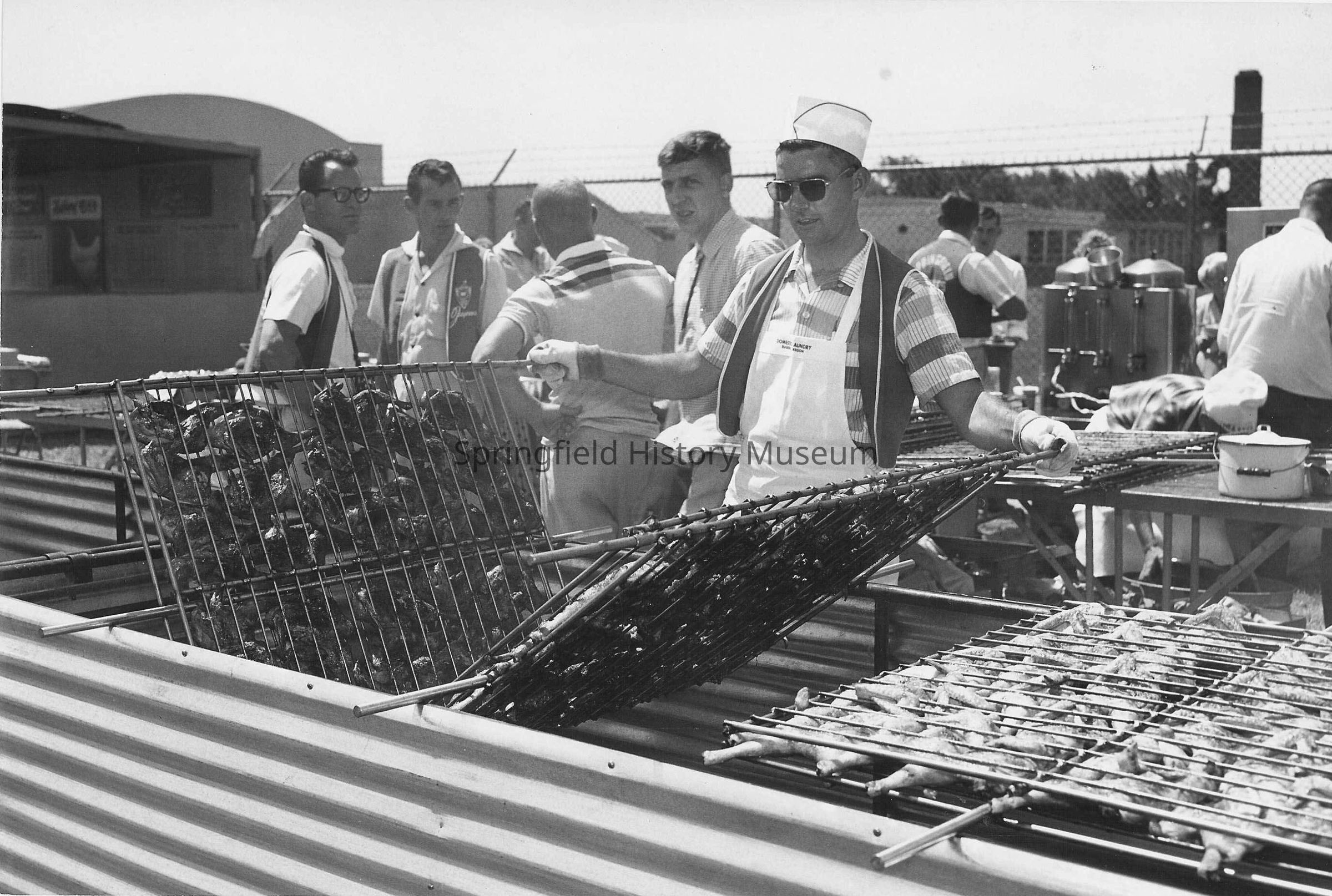 Photograph of a group of unknown men with broiler racks, 1957