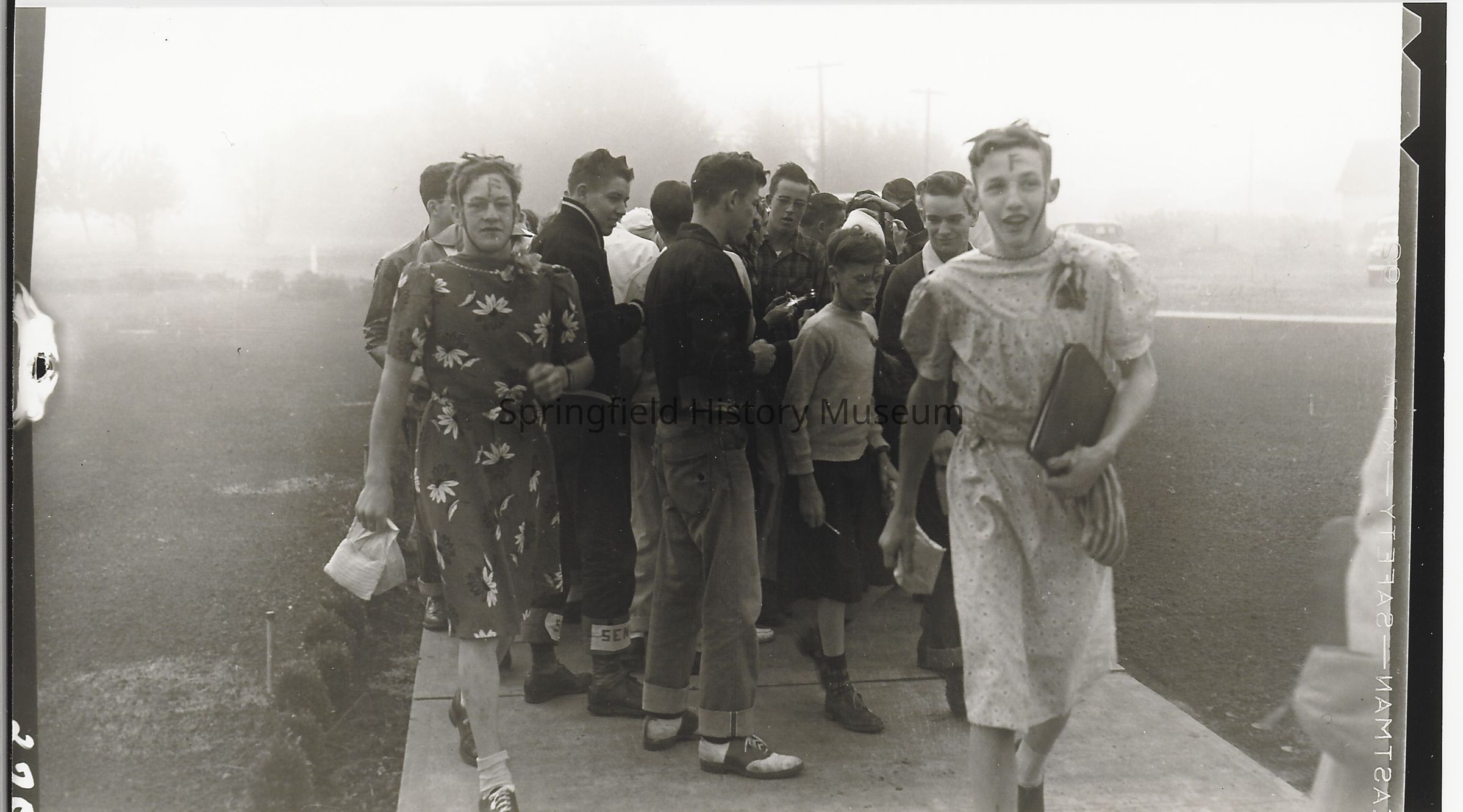 Photograph of a large group of unidentified boys, some dressed as girls during Springfield high school class of 1953 initiationPhotograph Details
