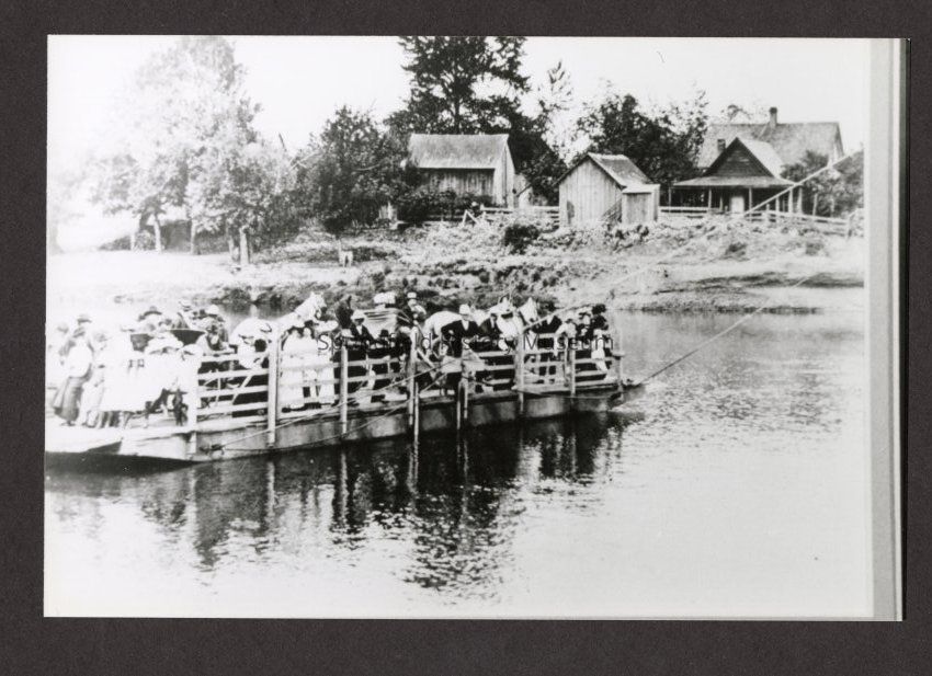 Photograph of unknown large group on ferry crossing river. Three wooden buildings on the bank in background, undated
