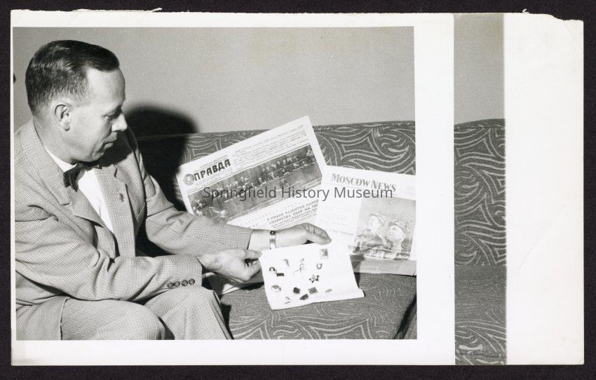 Photograph of a man and Russian newspapers, unknown date and locationEntry/Object ID