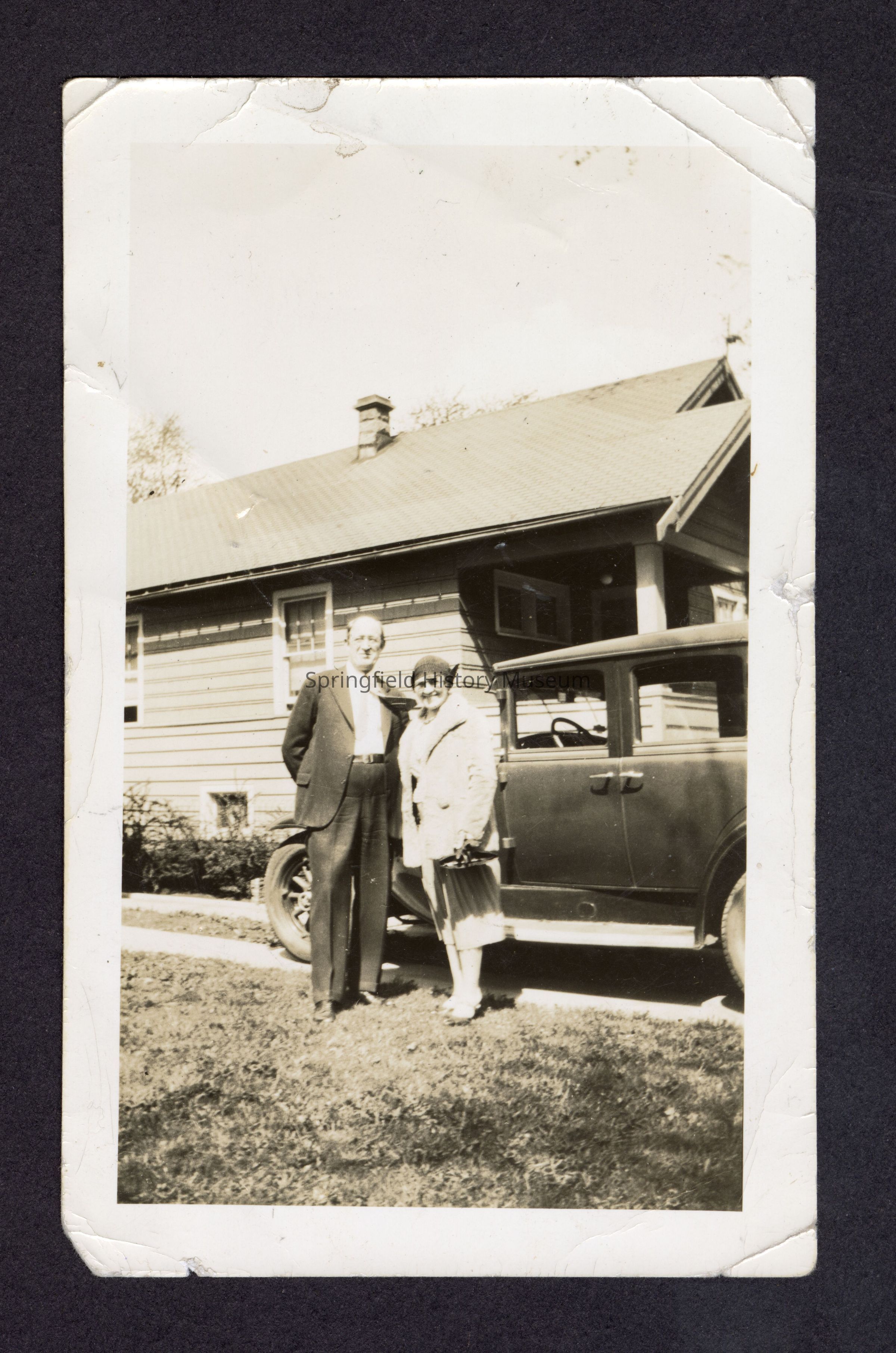 Photograph of a man and woman in front of a house and car, circa 1920. Automobile, possibly a Model T Ford.Acquisition