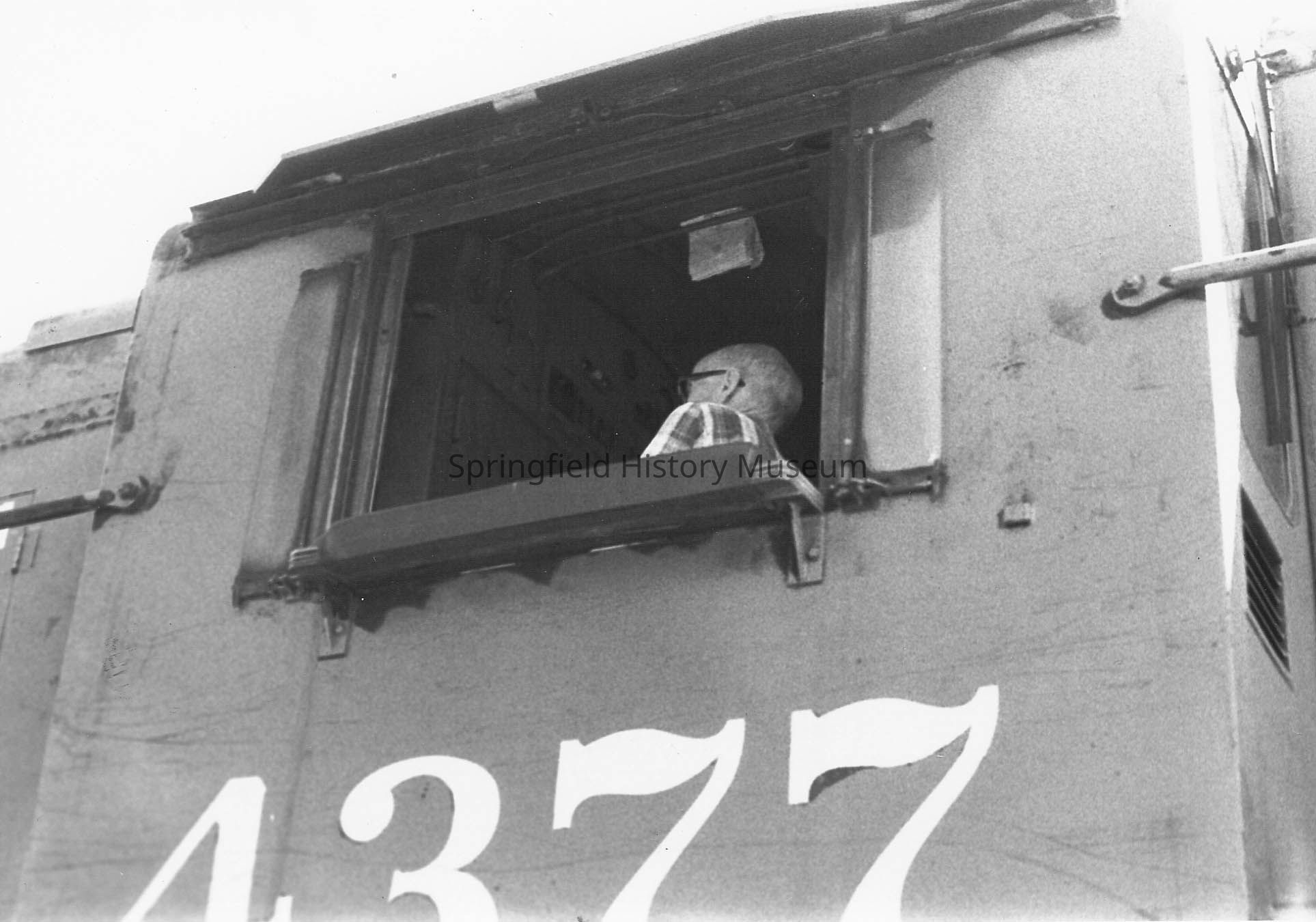 Man in railroad engine: large numbers on side of car read "4377", undated