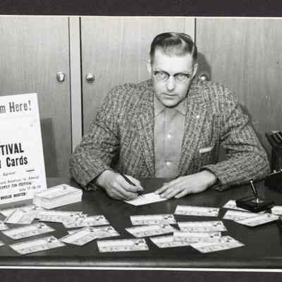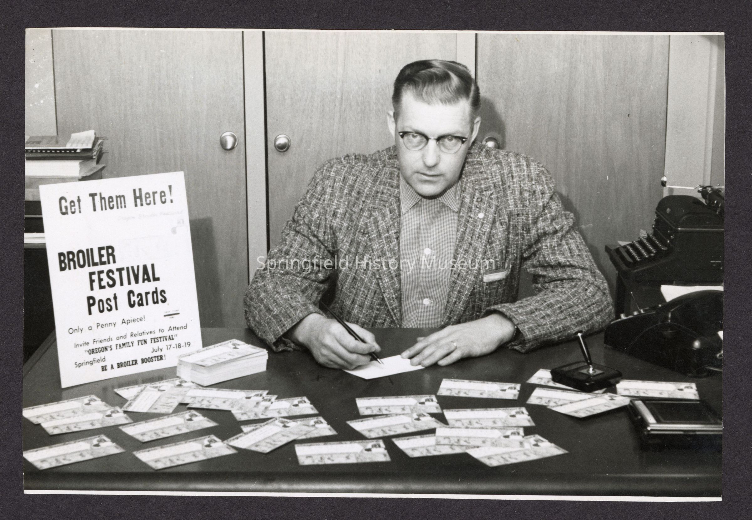 Photograph of a man signing Post Cards for the Broiler Festival. Date unknown.