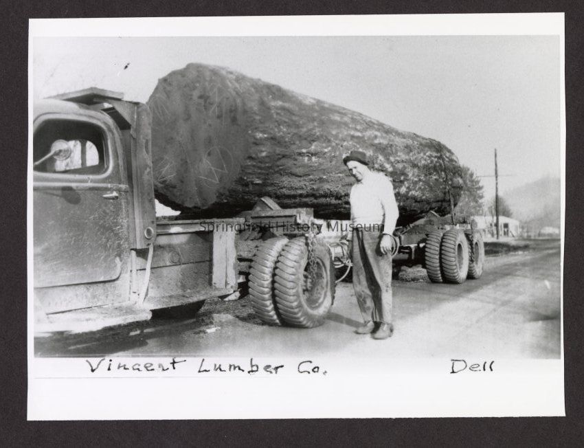 Photograph of Dell Pierson standing next to a Vincent Lumber Co. logging truck, Marcola, Oregon. Undated
