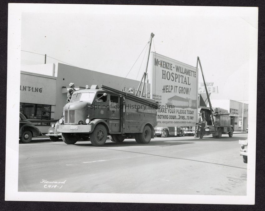 Photograph of a Moving Hospital Sign April 16, 1951. "McKenzie Willamette Hospital Help it grow!"Entry/Object ID