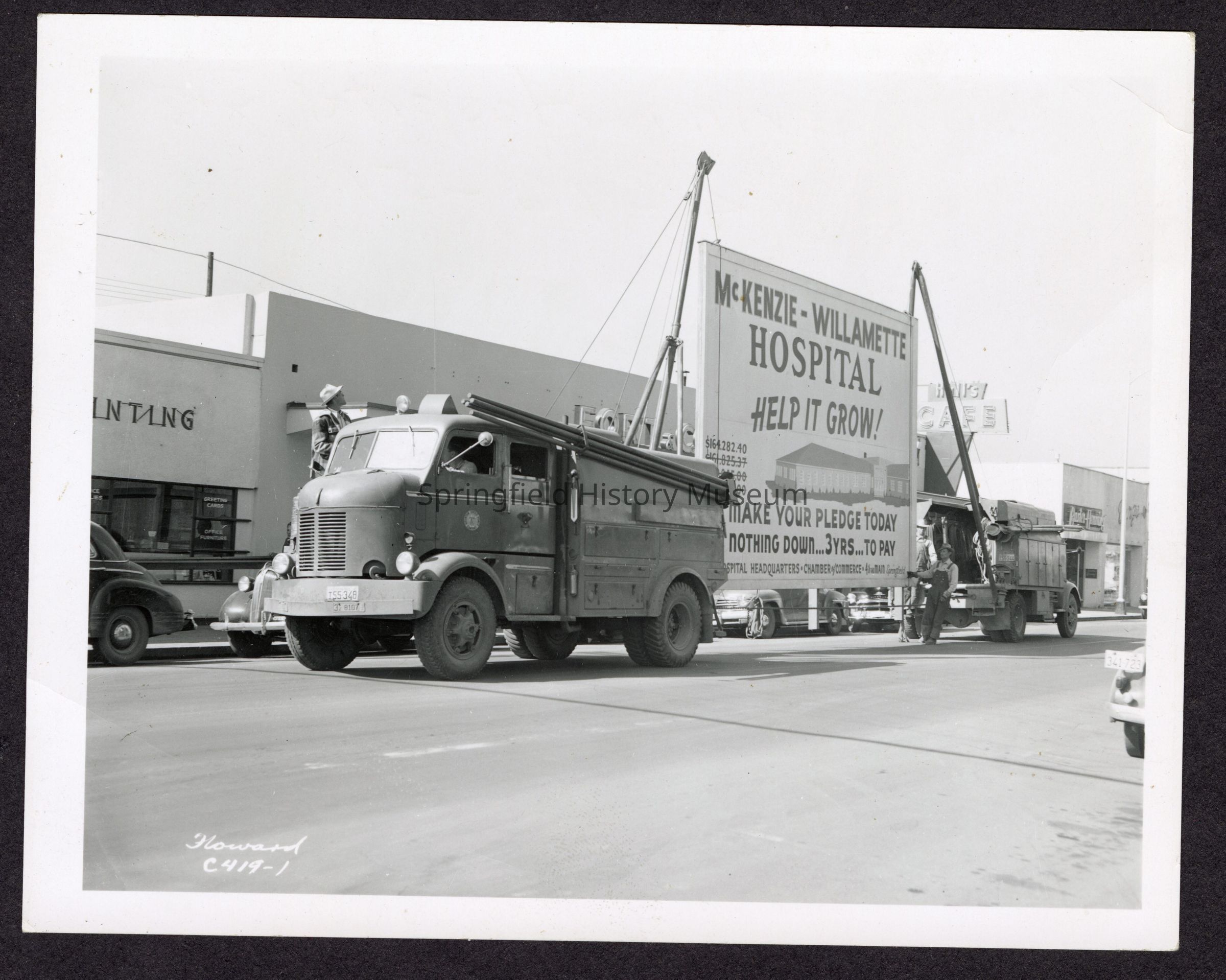 B&W Photo of a Moving Hospital Sign April 16, 1951. "McKenzie Willamette Hospital Help it grow!"Collection