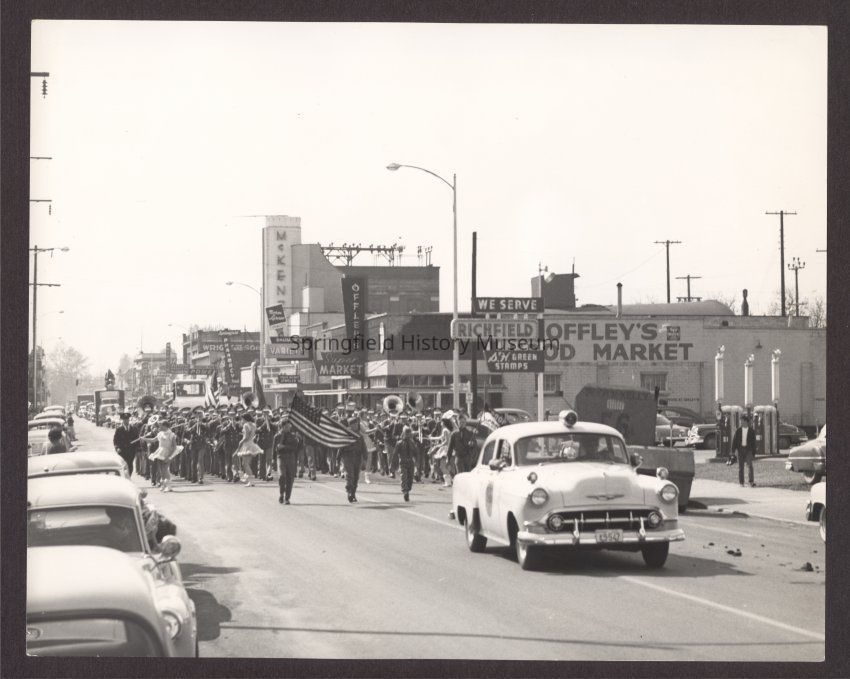 Photograph of a parade lead by 1950s police car, Boy Scouts with colors, and a marching band. 7th and Main Looking West. Date unknown.Entry/Object ID