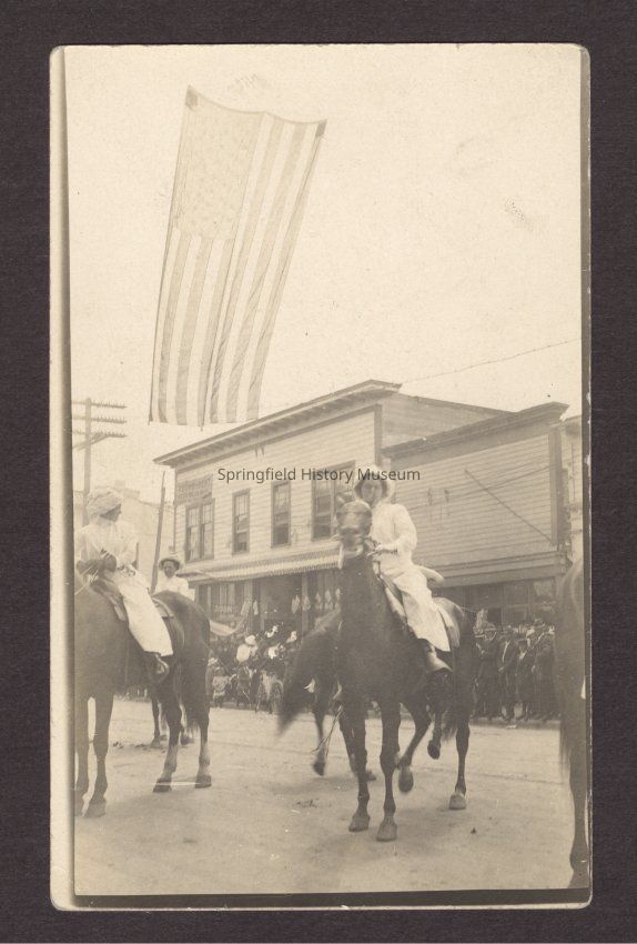 Photograph of a Post Card of a parade with three women on horseback. Date unknown.Entry/Object ID