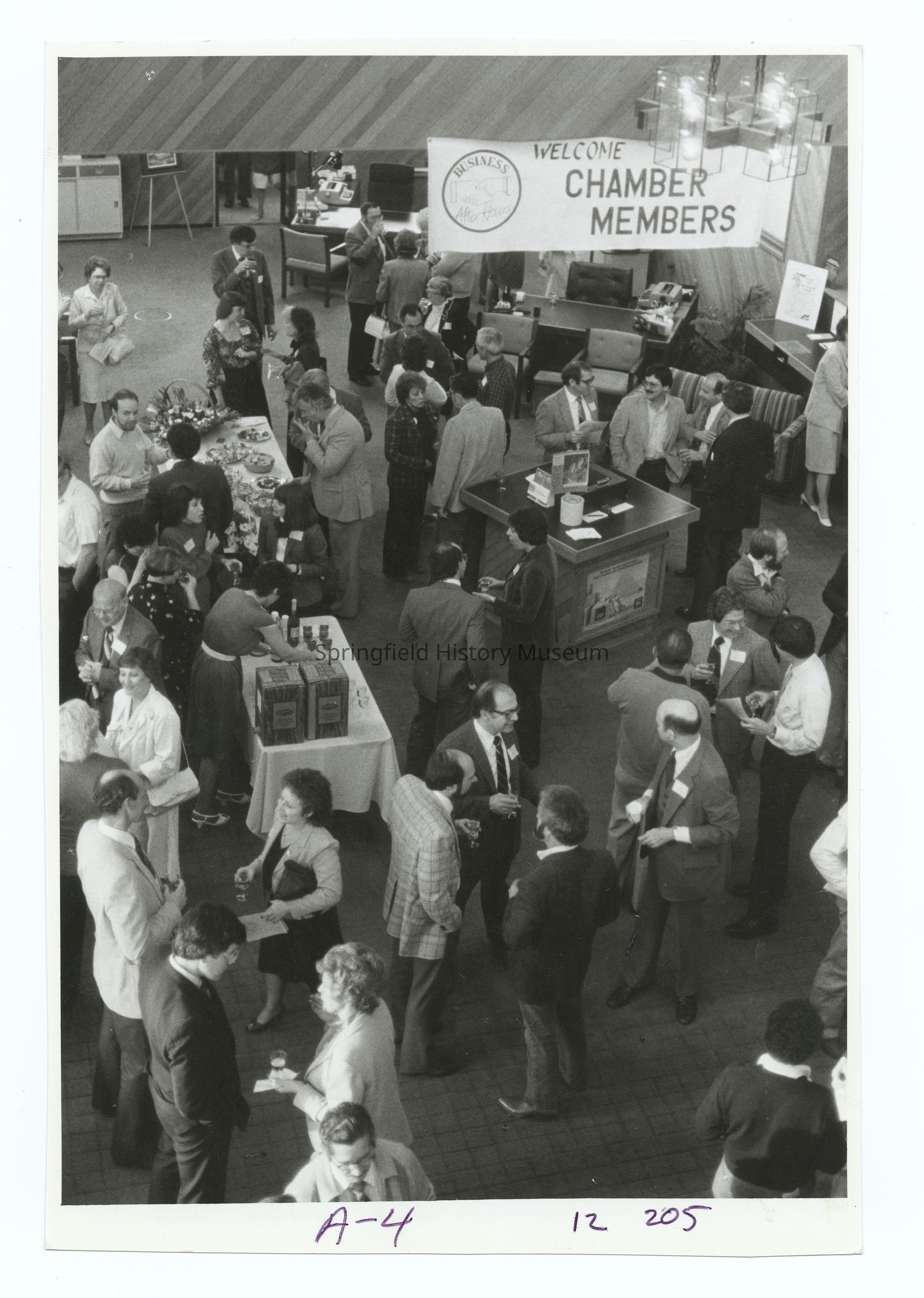 Photograph of a Springfield Chamber of Commerce event, undated, circa 1980. Banner says "Welcome Chamber Members"Photograph Details