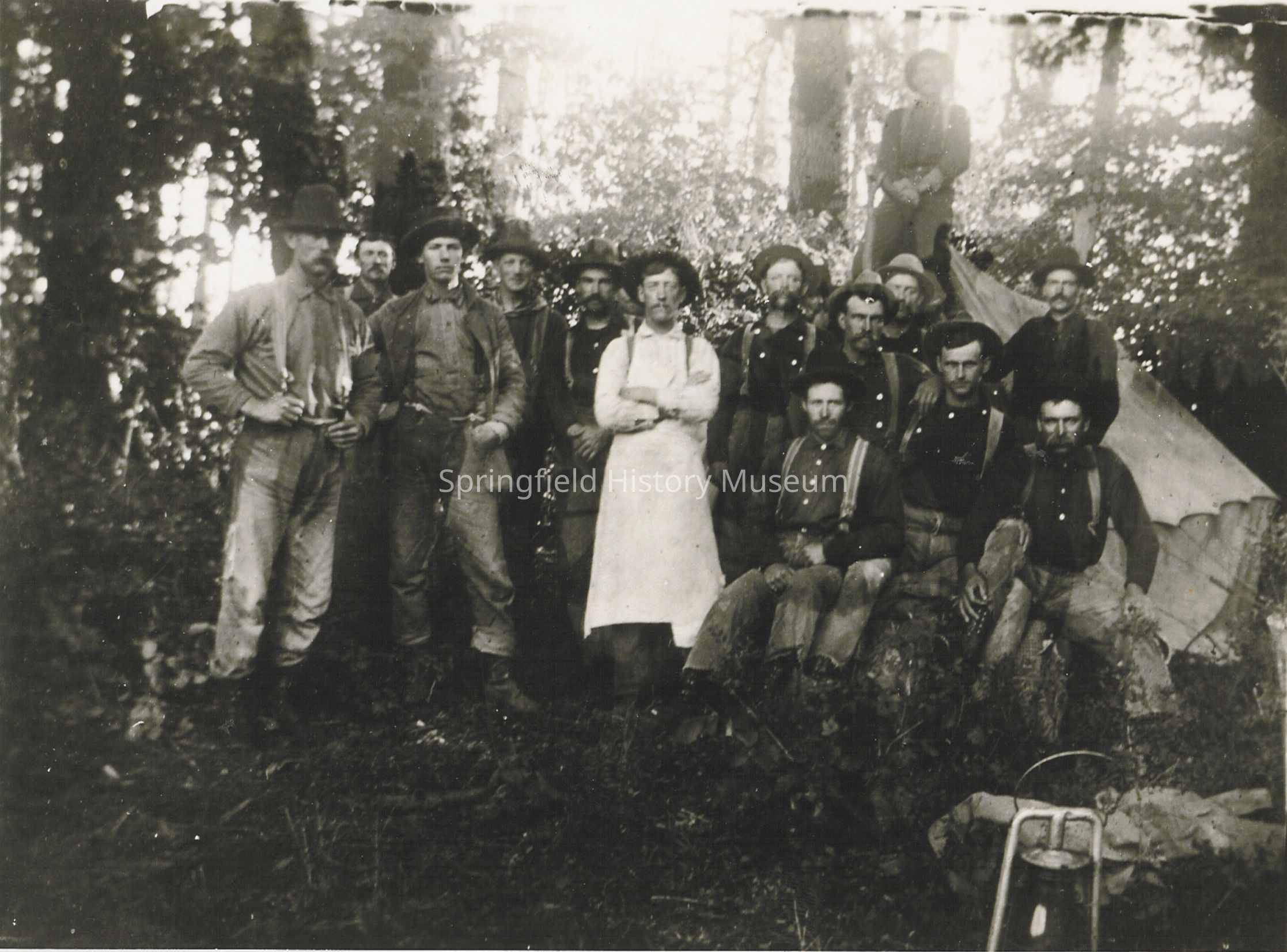 Logging Crew group of fourteen men. Glen Anderson is fourth from the left. Undated. Accession book says "negative #17"Collection