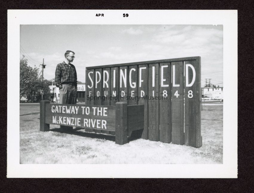 Photograph of a Springfield sign, "Springfield Founded in 1848 Gateway to the McKenzie River." April 1959.Entry/Object ID