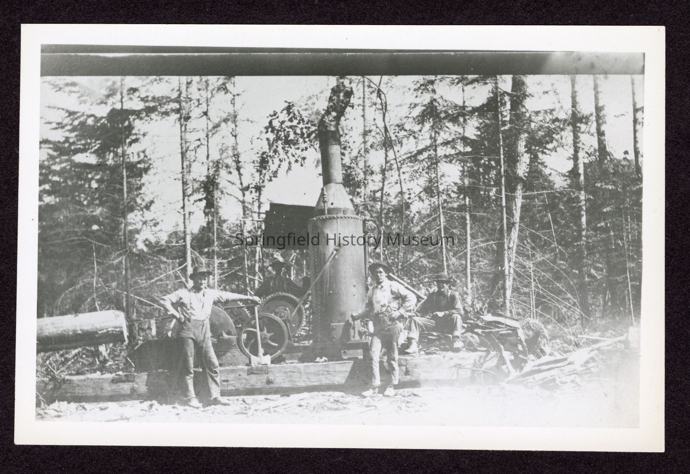 Photograph of a Steam Donkey and its crew. Date unknown.