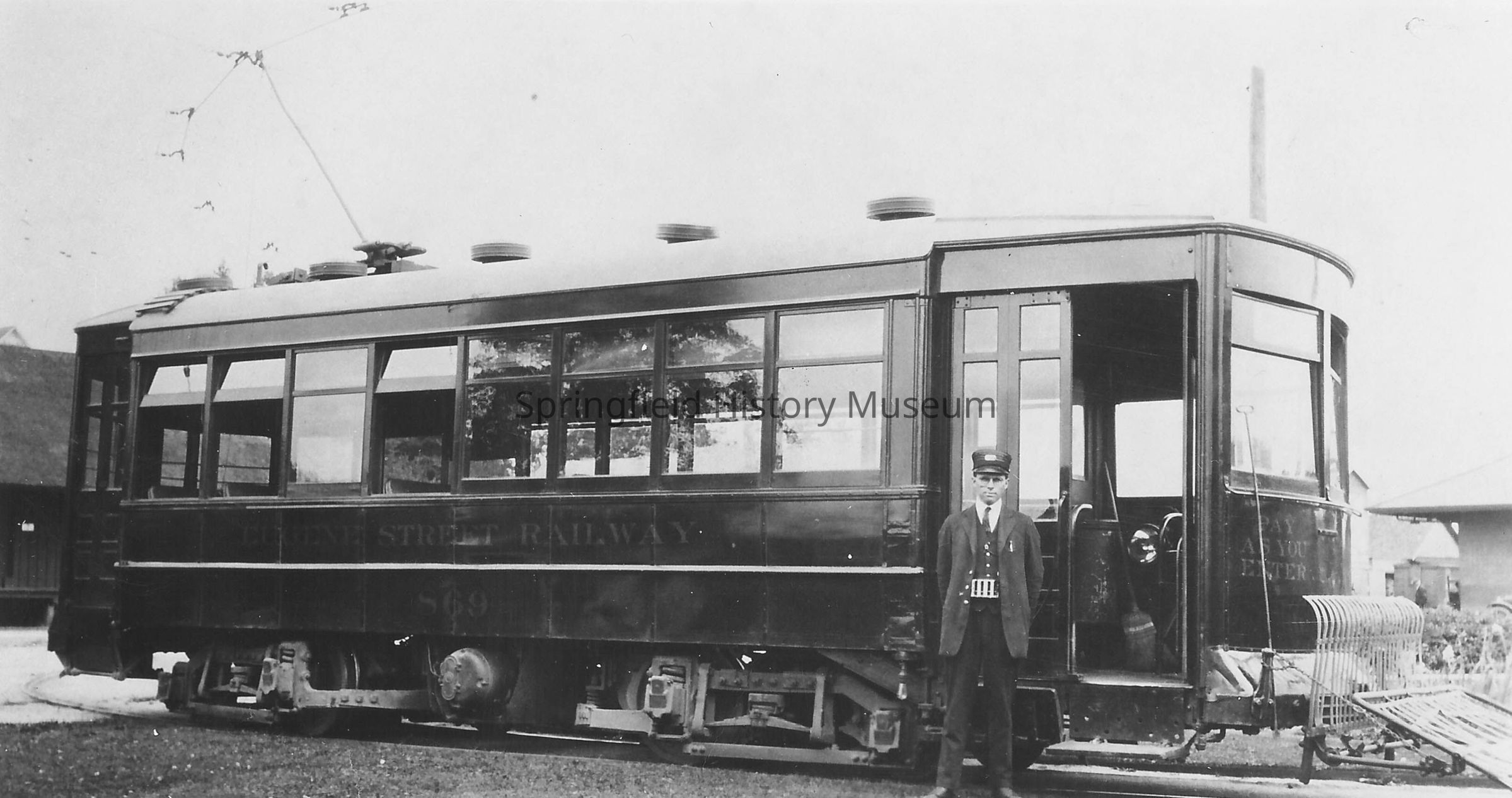 Photograph of Street car with a conductor standing beside it. Lightly on the side is written Street Railway. Photographer is James R Summer, 1284 Modoc Street, Springfield, Oregon. From a private source man is identified as Whittaker, a "Boomer" who moved from business to business.Collection