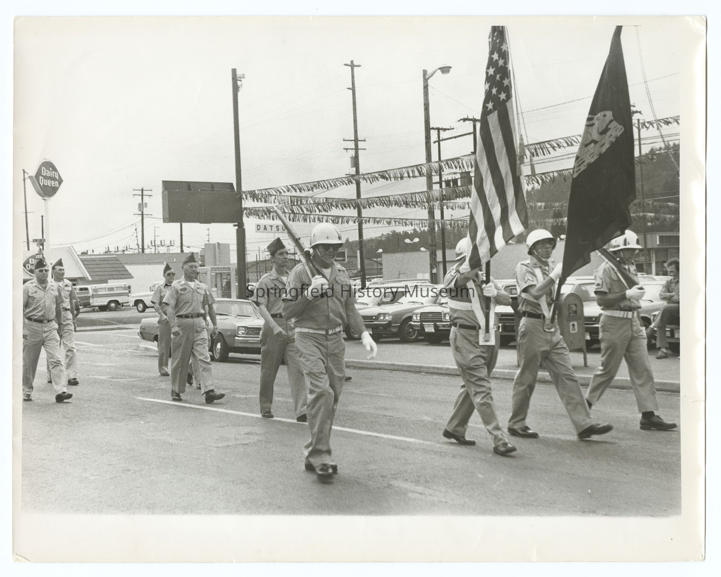 Photograph of a Summer Parade, Springfield, circa 1980, undated. U.S. Army (Jackrabbit insignia?). Dairy Queen in the background.Photograph Details
