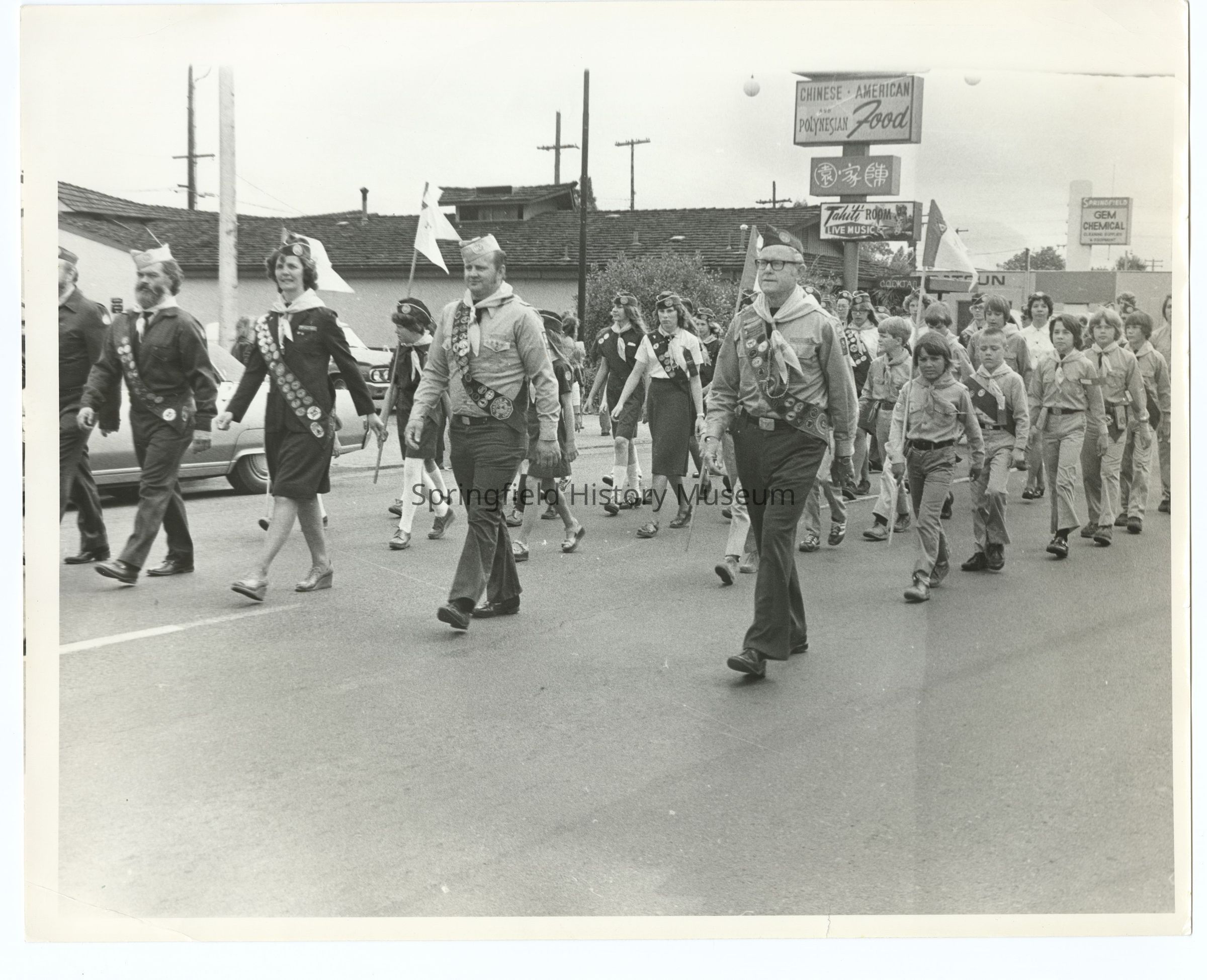 Photograph of a Summer Parade, Springfield, circa 1980. Oregon Pathfinders District 4. Sign in background is for Trader Lee Restaurant on the corner of 9th and Main (now called Great Wall Restaurant), a Chinese-American restaurant started by local restauranteur Ada Lee in the 1970s.Photograph Details