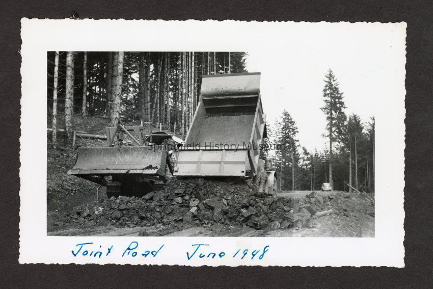 Photograph of a truck and tractor on a road with rubble in from of them, in pen on bottom: "Joint Road, June 1948"