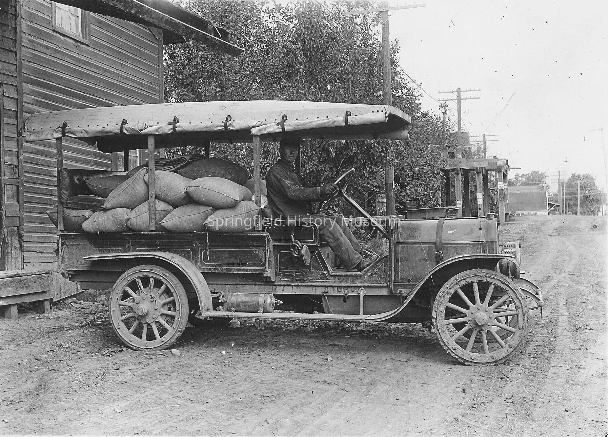 Photograph of early truck loaded with grain sacks. Truck with a canvas top rolled up on sides. Driver appears to be in center or right side of truck seat. Possibly parked by flour mill. Copy. UndatedCollection