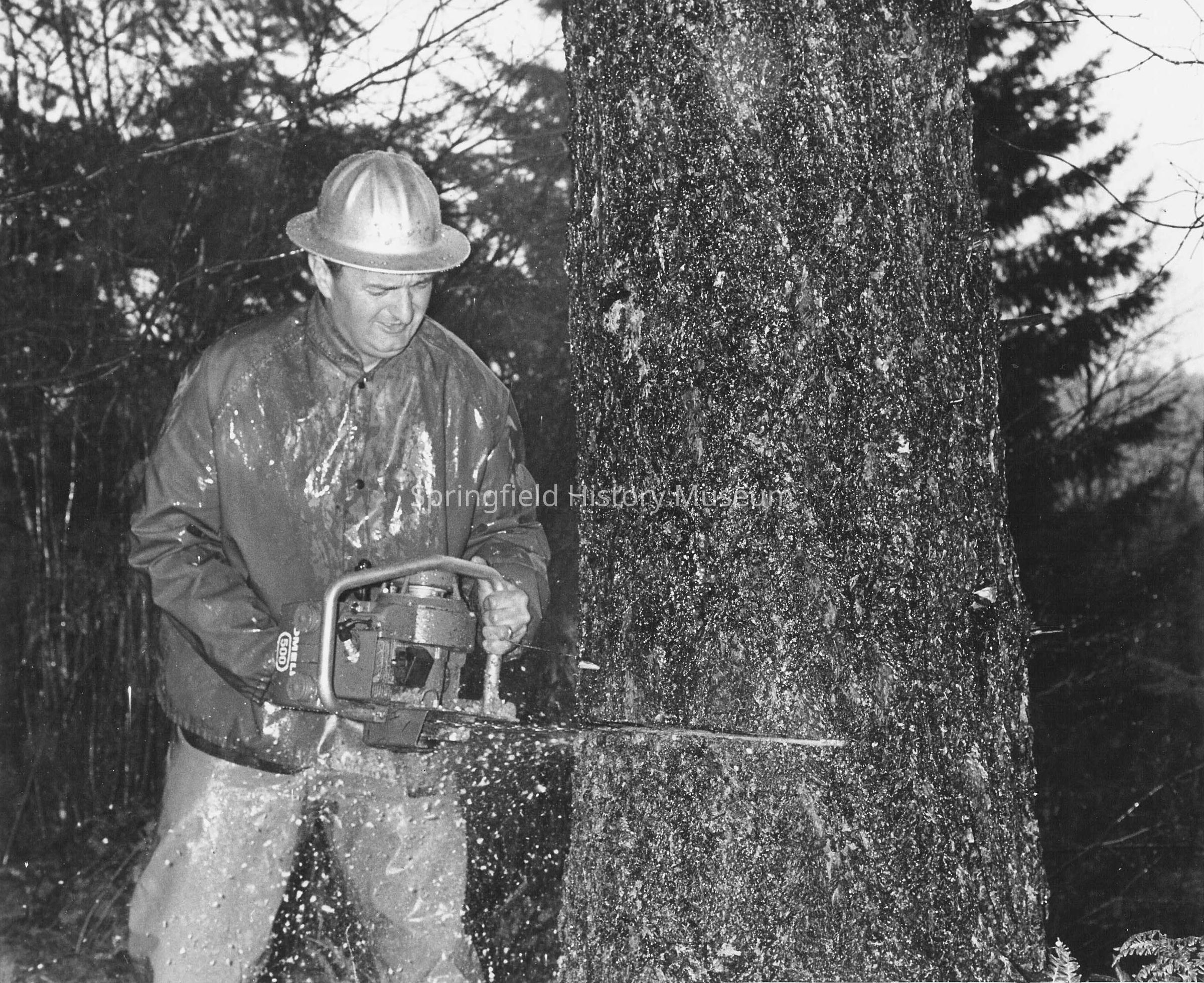 Photograph of an unidentified logger in a rain jacket and hard hat with a chainsaw beginning a cut. Undated