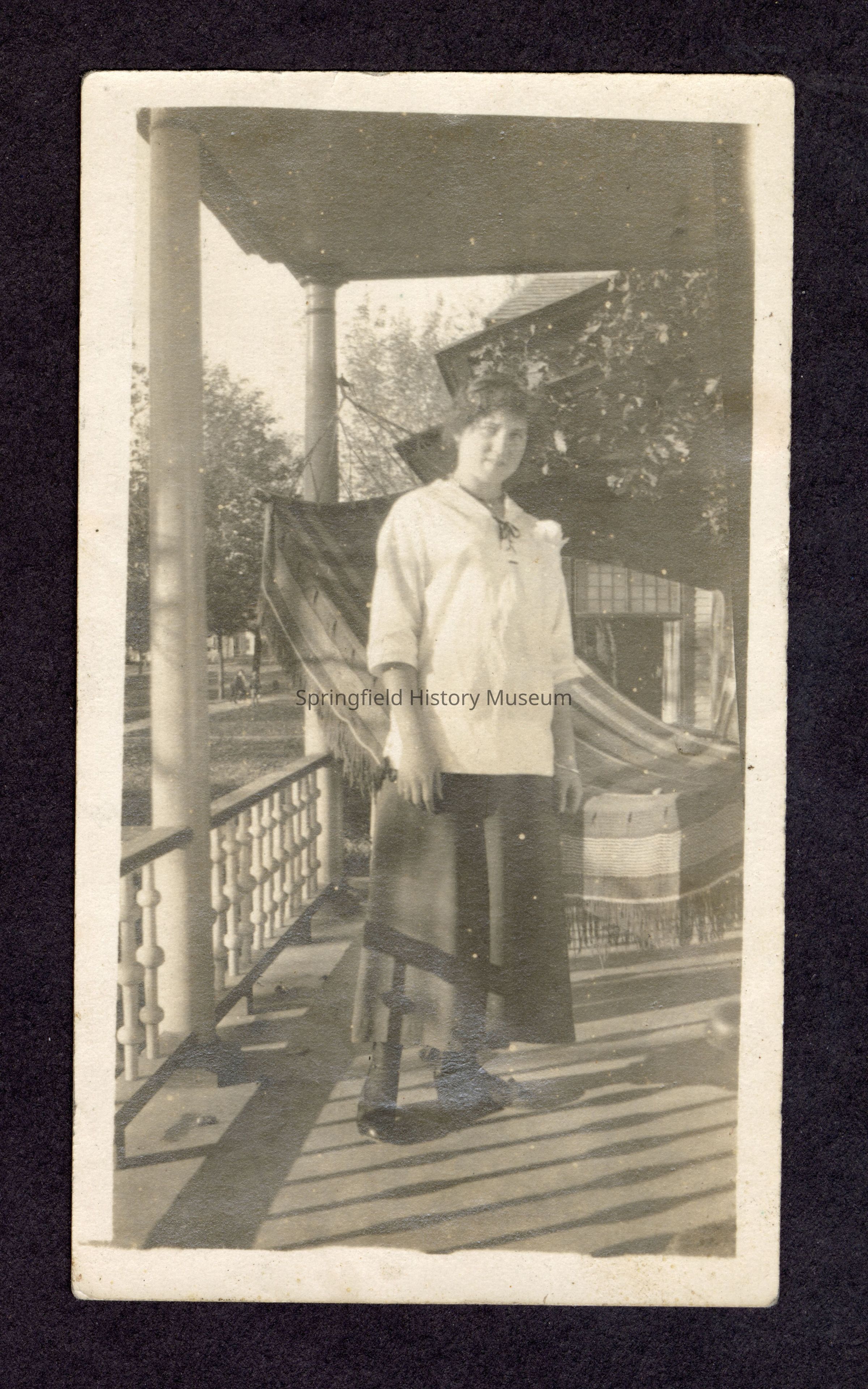 Black and white photograph of a woman standing on a porch. Undated, probably circa 1910s based on her clothing.
