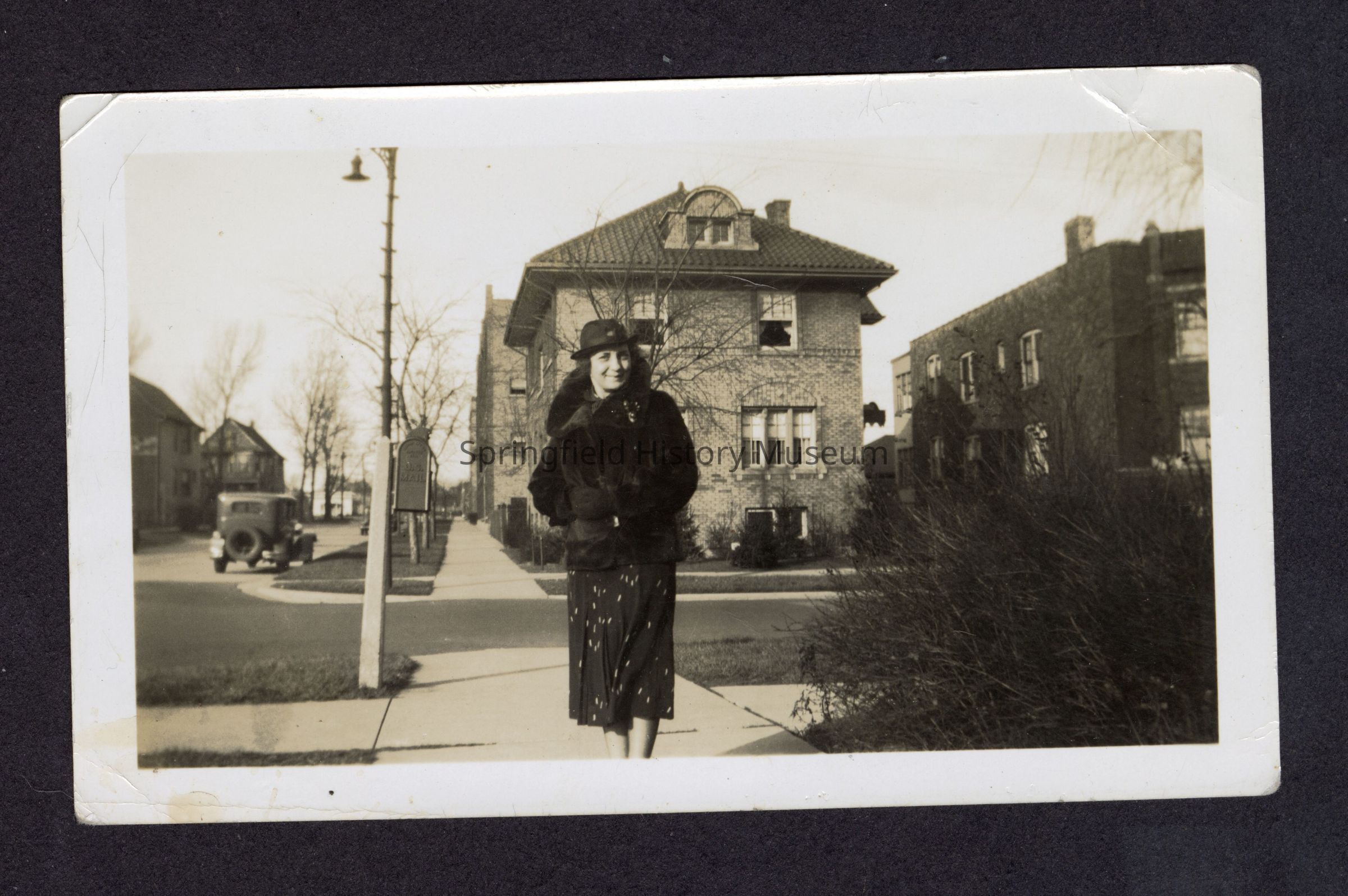 Photograph of a woman posing in front of brick houses, undated