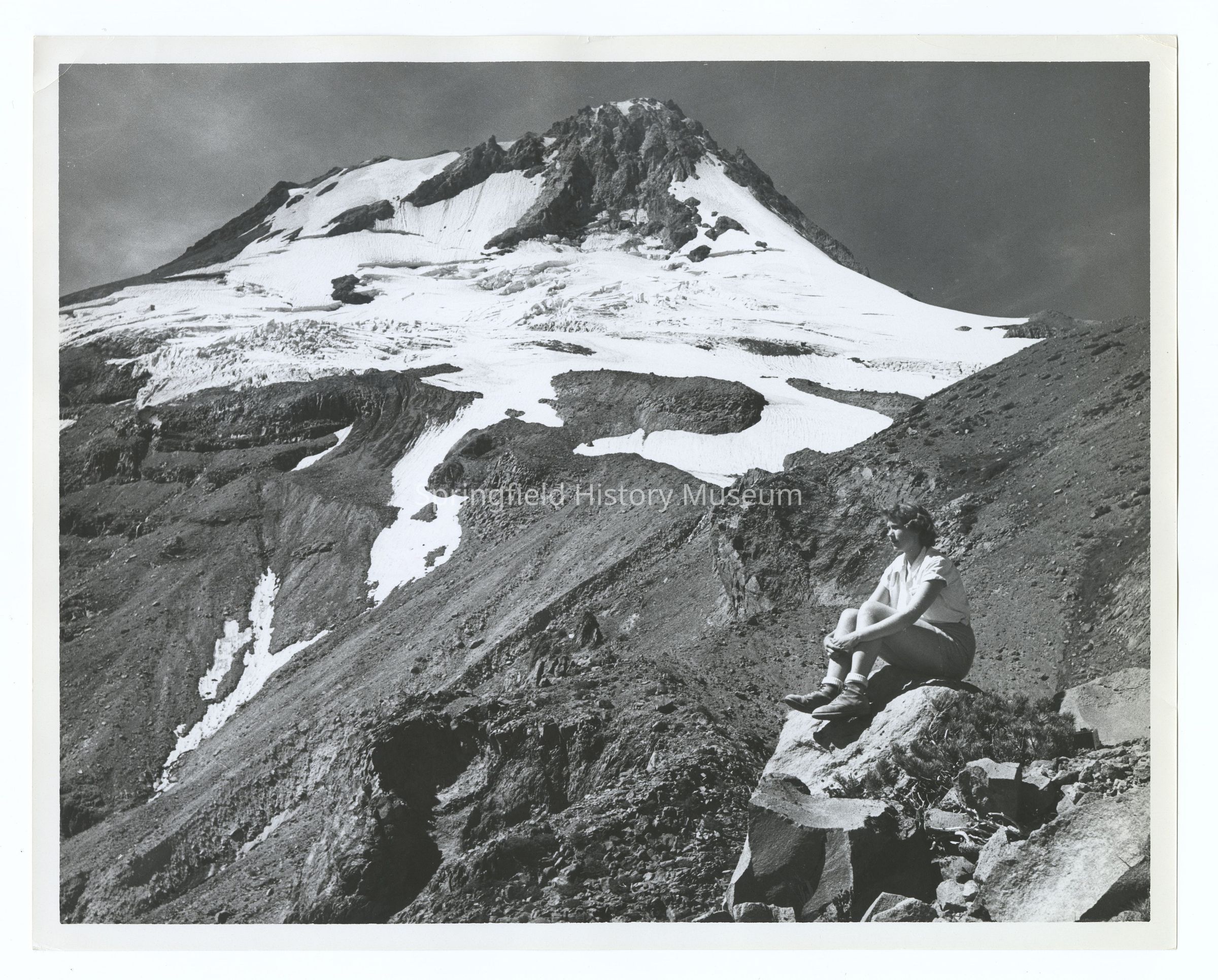 Photograph of a woman sitting on a rock, near Tam McArthur Rim (?), Oregon, undatedEntry/Object ID