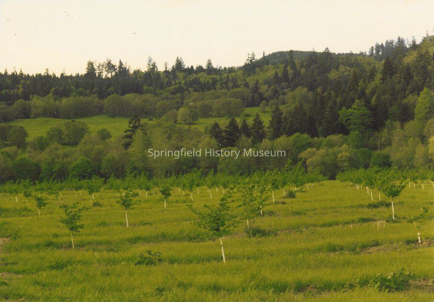 Young orchard in front of rolling hills, 1996. Seavey farm.