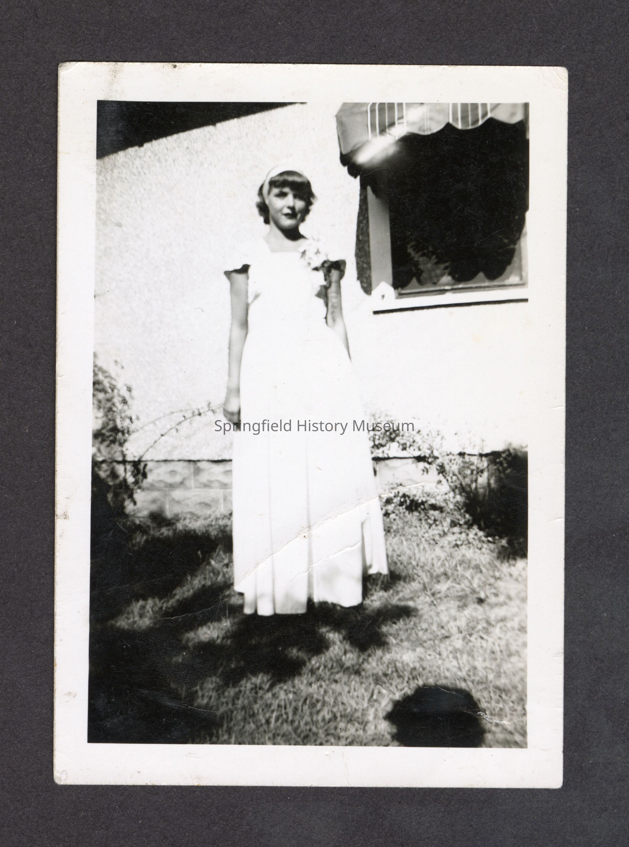 Black and white photograph of a woman in a long dress and corsage standing in front of a house. Written on back, "58-1." Undated.