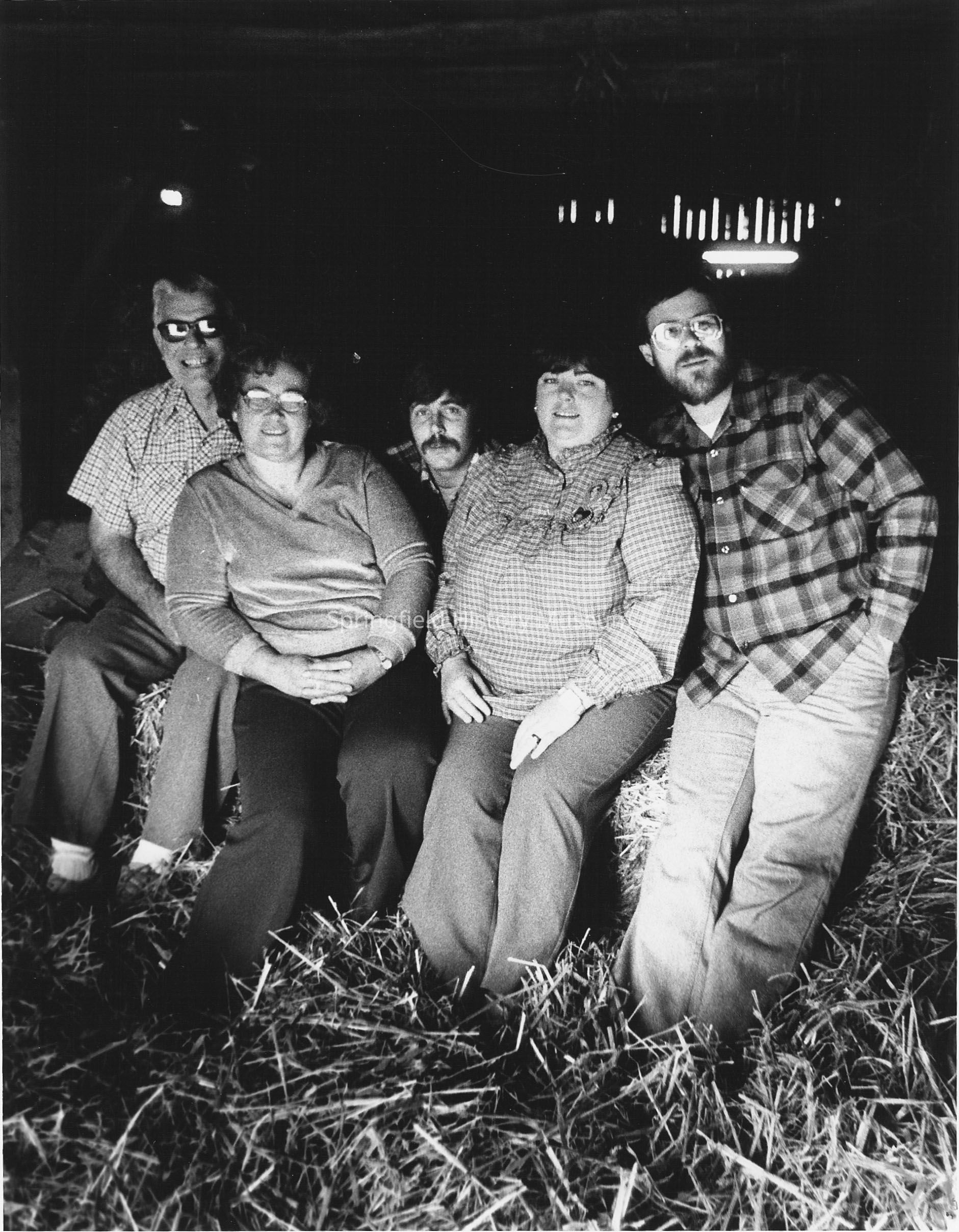 The family that owns Adams Feed & Seed in Springfield. Names of people are identified on back of photo; Bob Adams, his wife, Roberta (Bobbie), their youngest son, Richard, Lori Adams, her husband, Rob Adams (Bob's son), 2 daughters not shown are Sandra and Amy. No date, Springfield News photo.