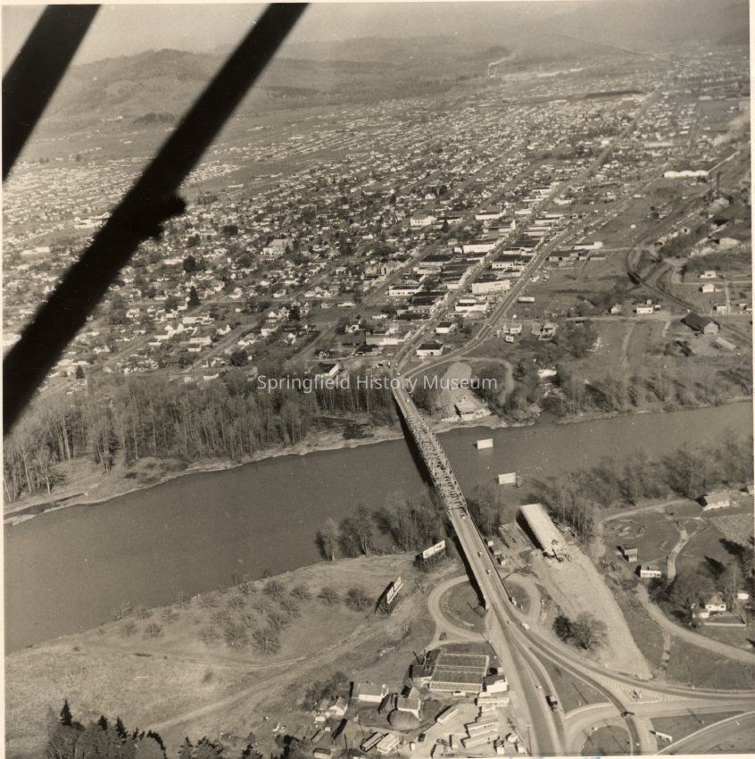 Photograph of aerial view of new Springfield bridge in use, Springfield, Oregon, 1957Entry/Object ID