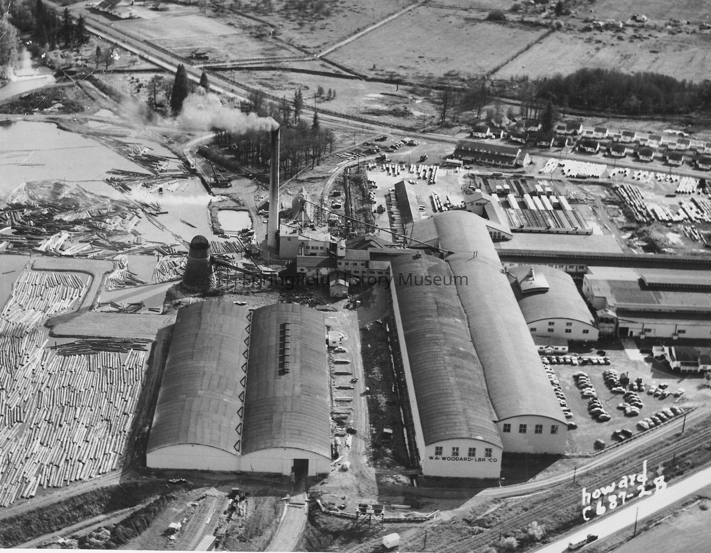 Aerial view of W. A. Woodward Lumber Company in Cottage Grove. Marked on front Howard C687-8. UndatedPhotograph Details