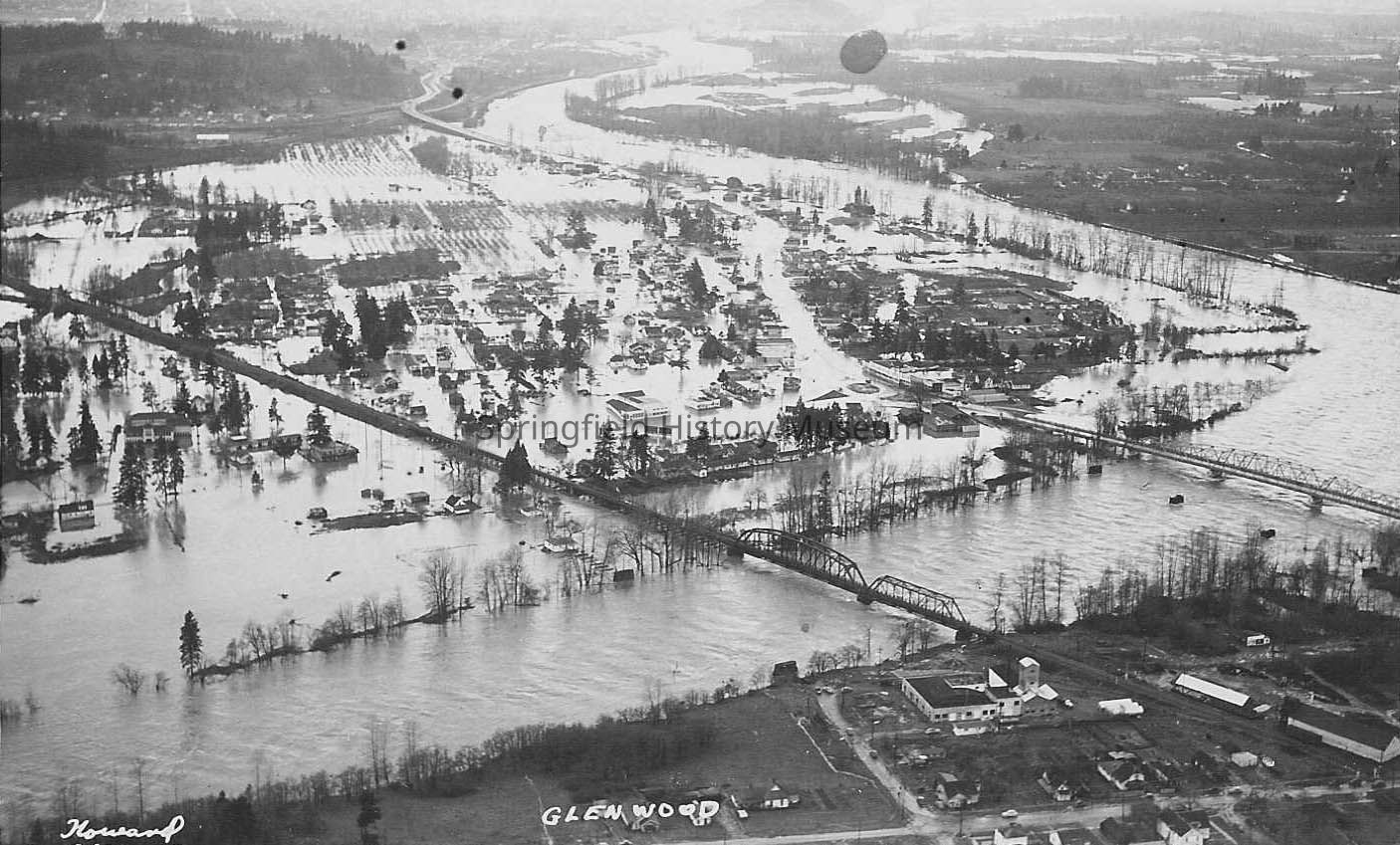 Floods, Aerial Views, Floods, Glenwood, Aerial Views, Railroad Bridge, Car Bridge, Willamette River, Skinner's Butte, Floods--Glenwood, Glenwood--Aerial Views, Transportation--Roads & Bridges, Waterways--Willamette River, Geographical Features--Skinner's Butte