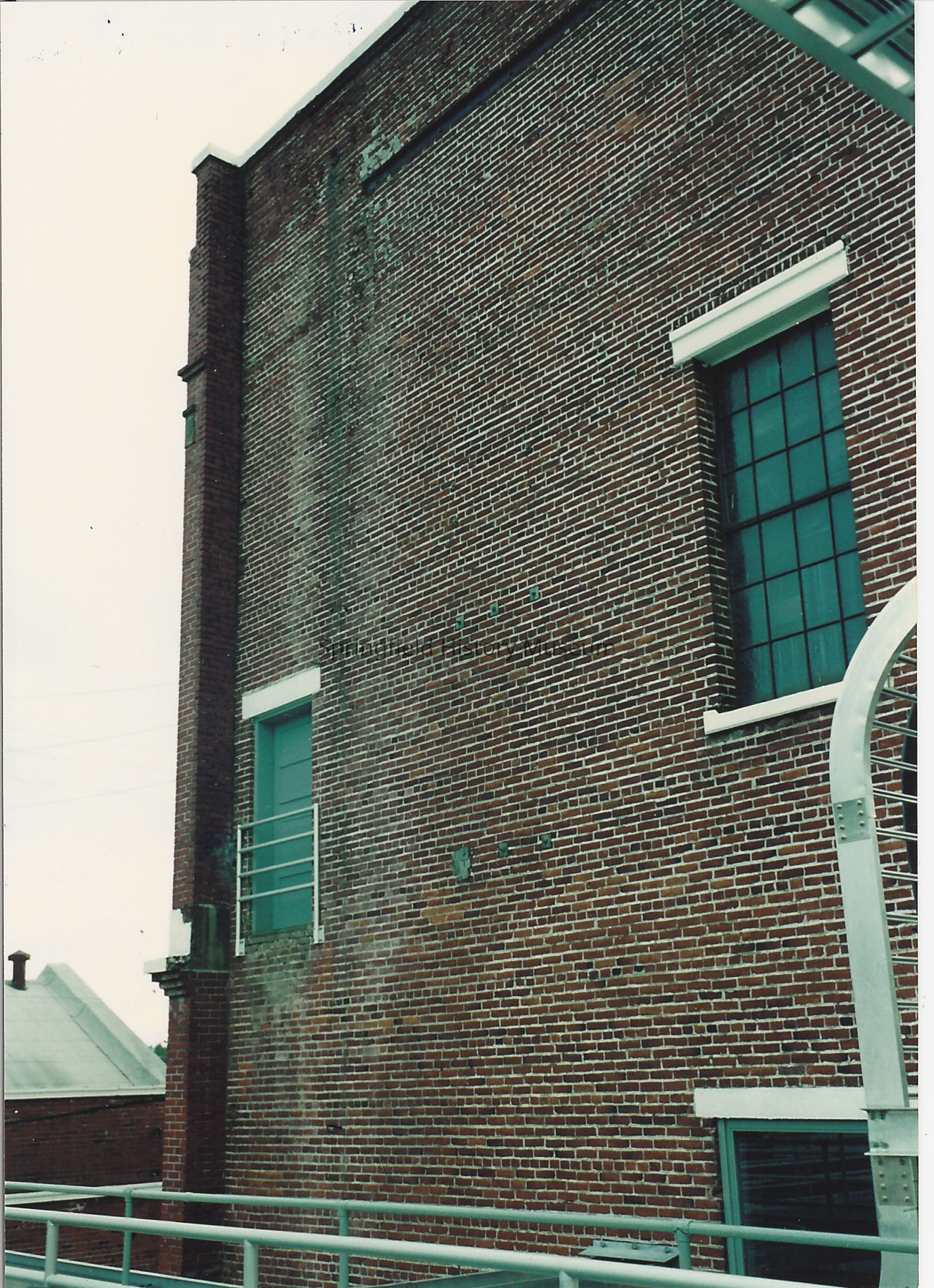 Color photo of the exterior of the Albany Electric Plant in Albany, Oregon; built in 1908. Building is a twin to the Springfield Museum building. Photo taken by Kathy Jensen in 1991.