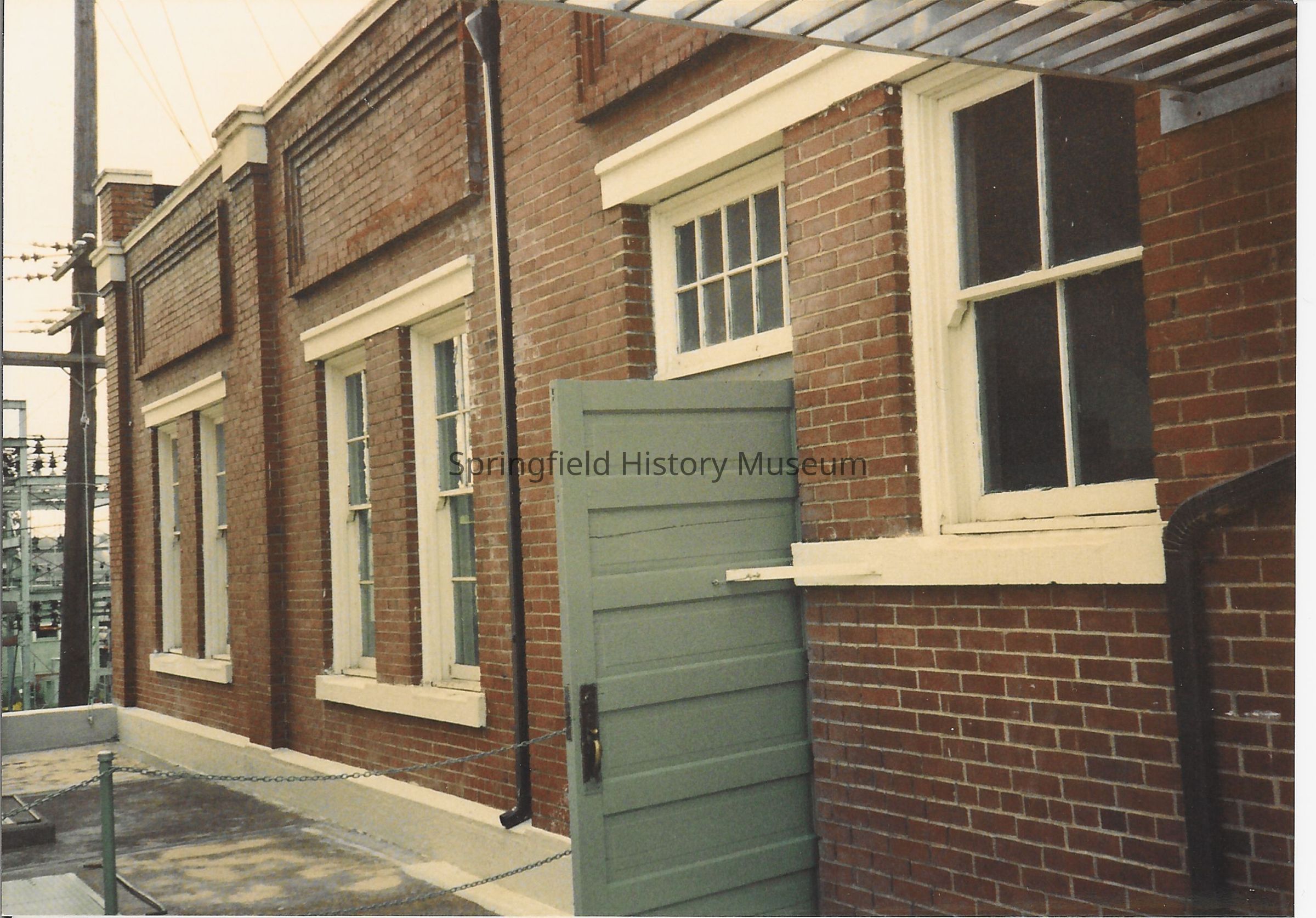 Color photo of the exterior of the Albany Electric Plant in Albany, Oregon; built in 1908. Building is a twin to the Springfield Museum building. Photo taken by Kathy Jensen in 1991.
