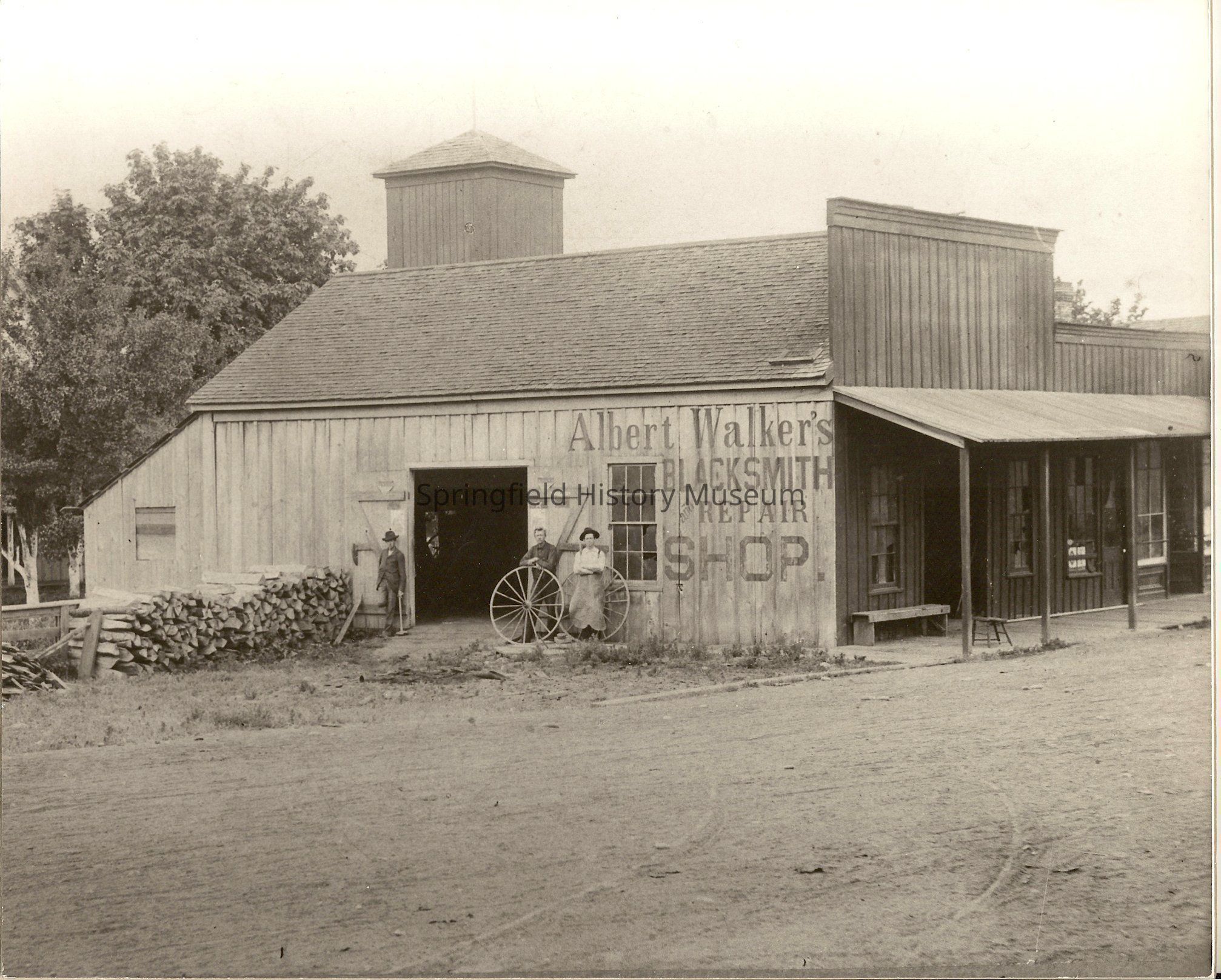 Albert Walker's blacksmith shop, built in 1888; taken in 1898. Albert Walker was Springfield's first Mayor in 1885.