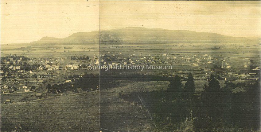 Photograph of an overview of Springfield from hill [Willamette Heights] looking northwest across Willamette river. View reaches from Judkins Point in Eugene to Eighth Street. Dated between 1902 and 1908. Includes a typed history below photo.Photograph Details