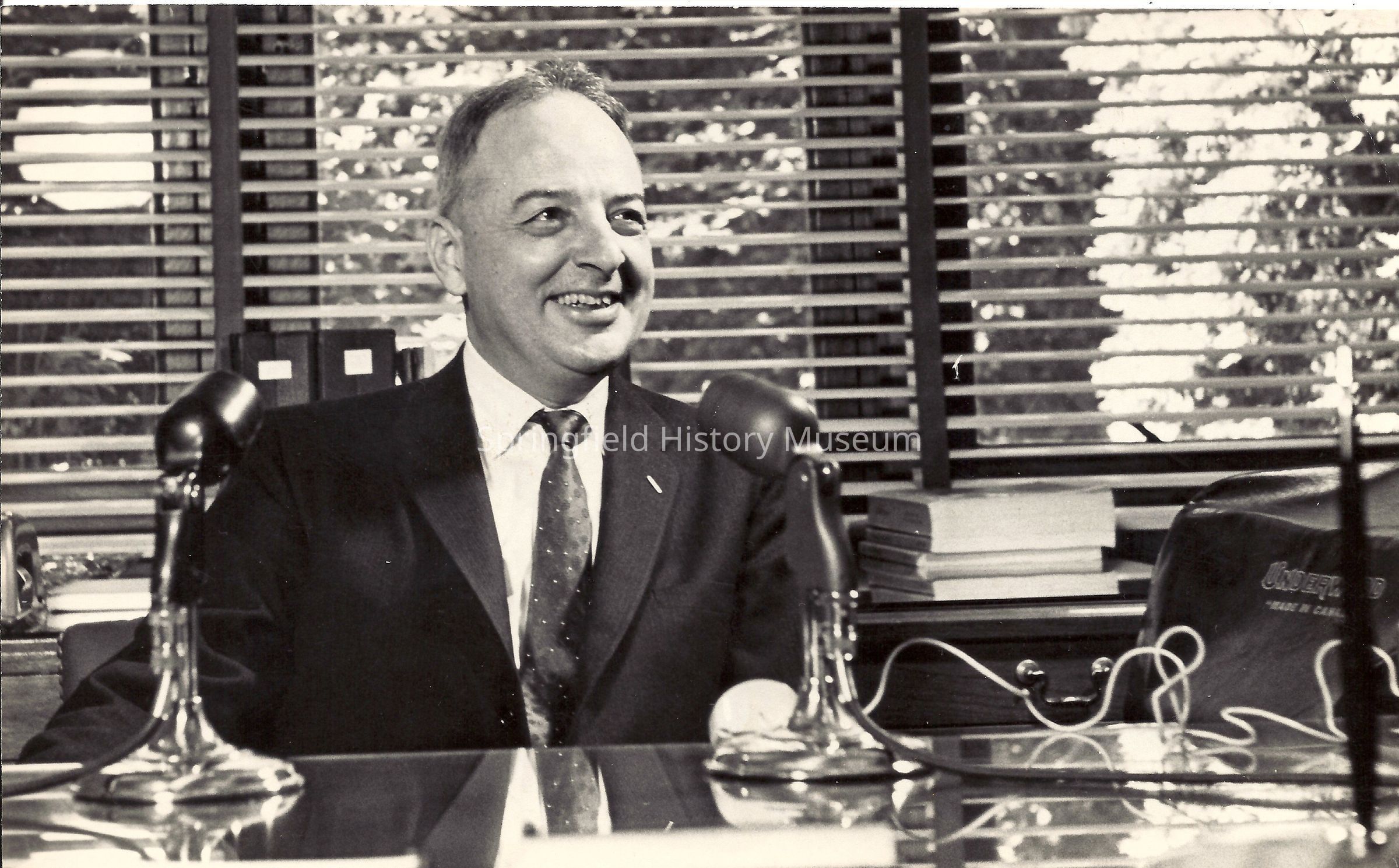 Photo of Arthur S. Fleming at a desk, he was the President of University of Oregon, from 1961-1968, undated