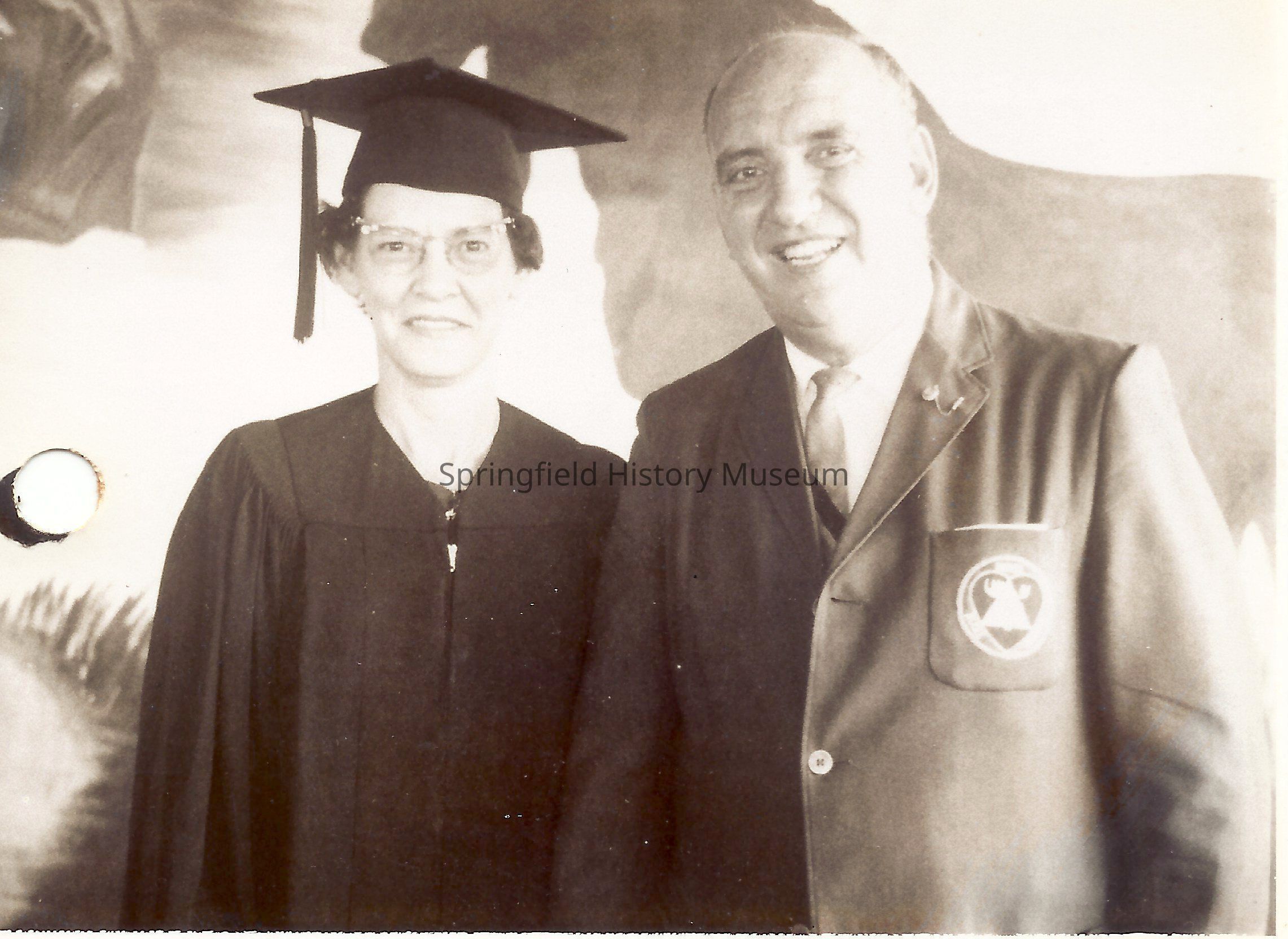 Photo of B.J. Rogers and unknown woman in cap and gown in front of moose insignia.Collection