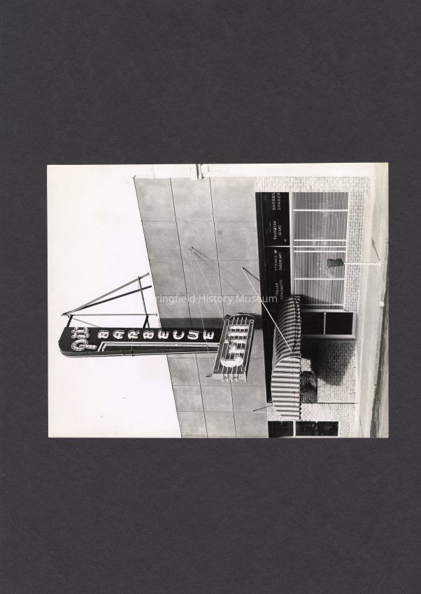 B&W Photo of Pit Barbecue Grill outside of building.