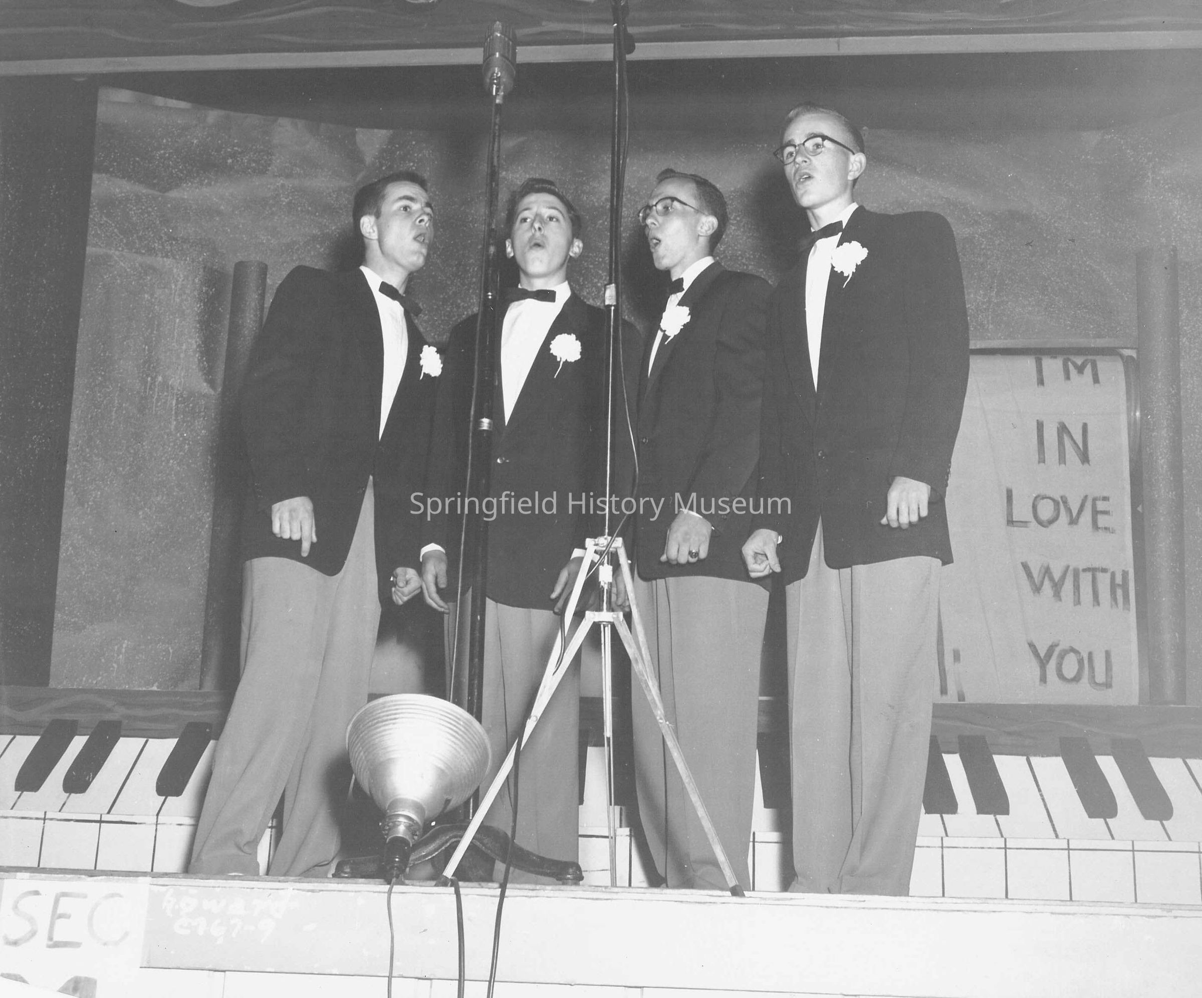 Photograph of four unknown young men singing. All are wearing dark jackets with bow ties, on stage. Taken in 1954. Part of the Barbershop Parade photos.
