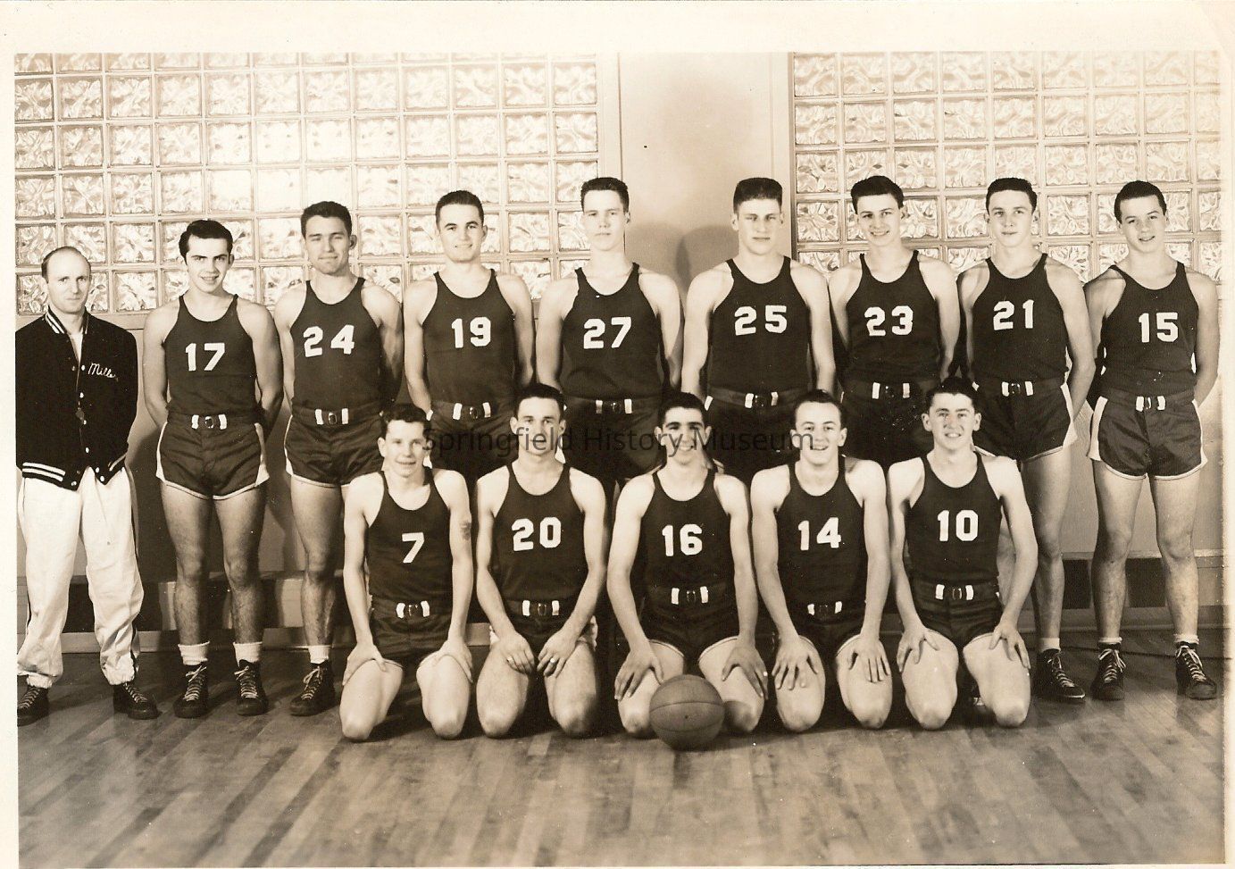 Photograph of basketball team, thirteen members and coach. Coach is wearing a jacket that has Millers on the front. The photo was taken in front of two glass block windows. undated, no names.Collection
