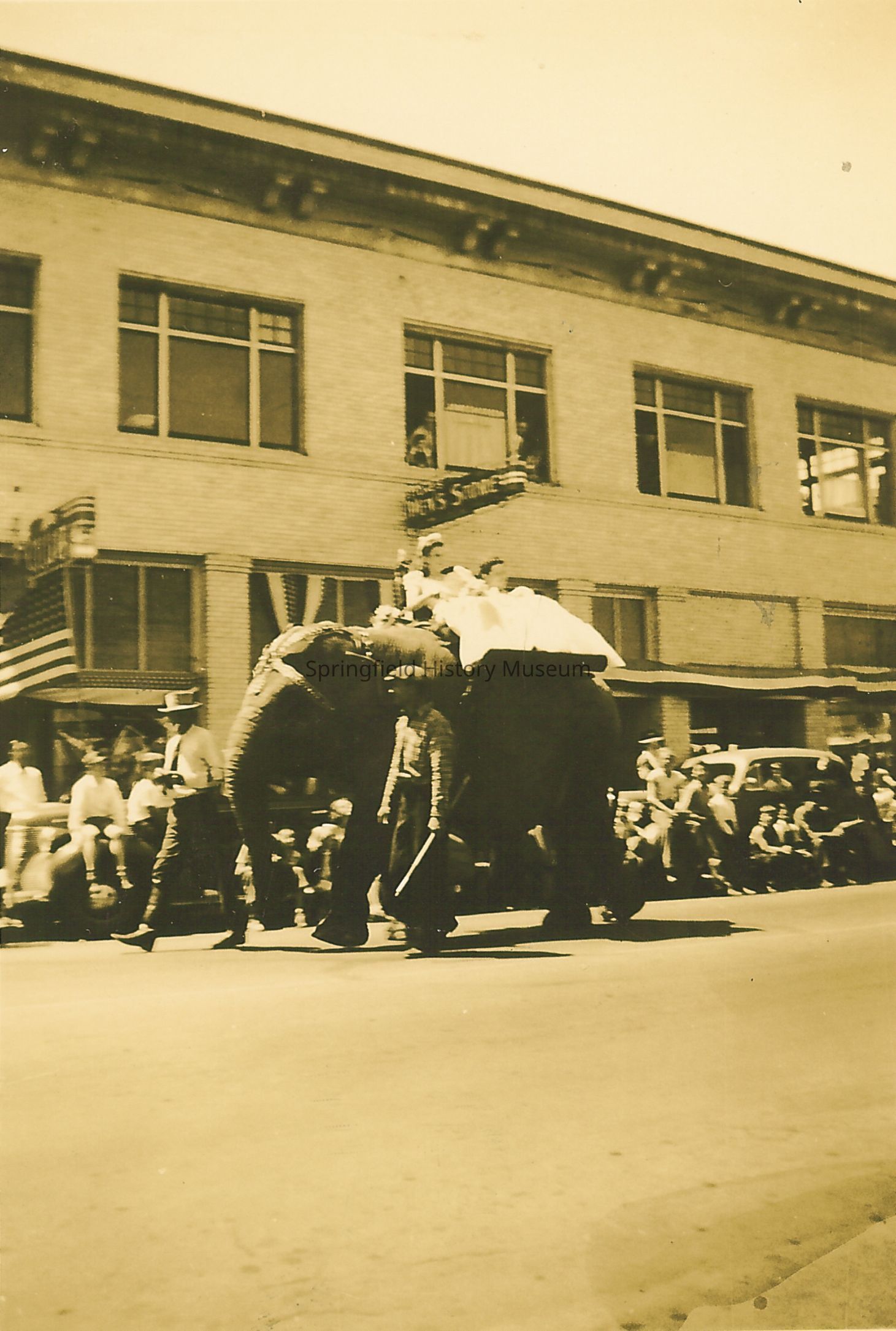 Beauty queens riding on an elephant. Springfield Industrial Parade, 1941