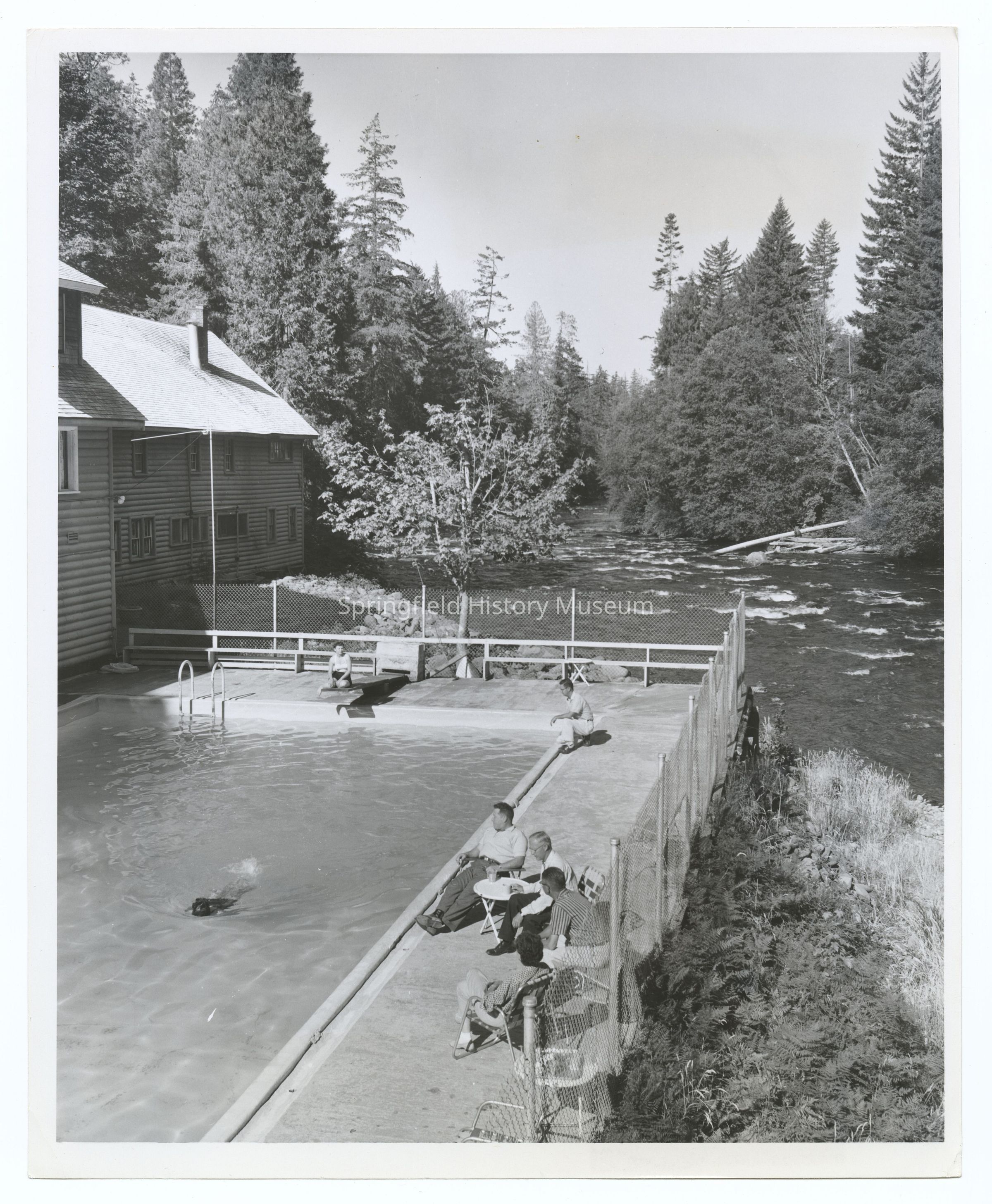 Inscription back: Modern vacation resorts line Oregon's trout-famous McKenzie River east of Eugene. This swimming pool at Belknap Springs is heated by water from hot mineral springs nearby. The McKenzie has a good trout season in spring and summer. Oregon State Highway Commission Photo # 6326Other Names and Numbers