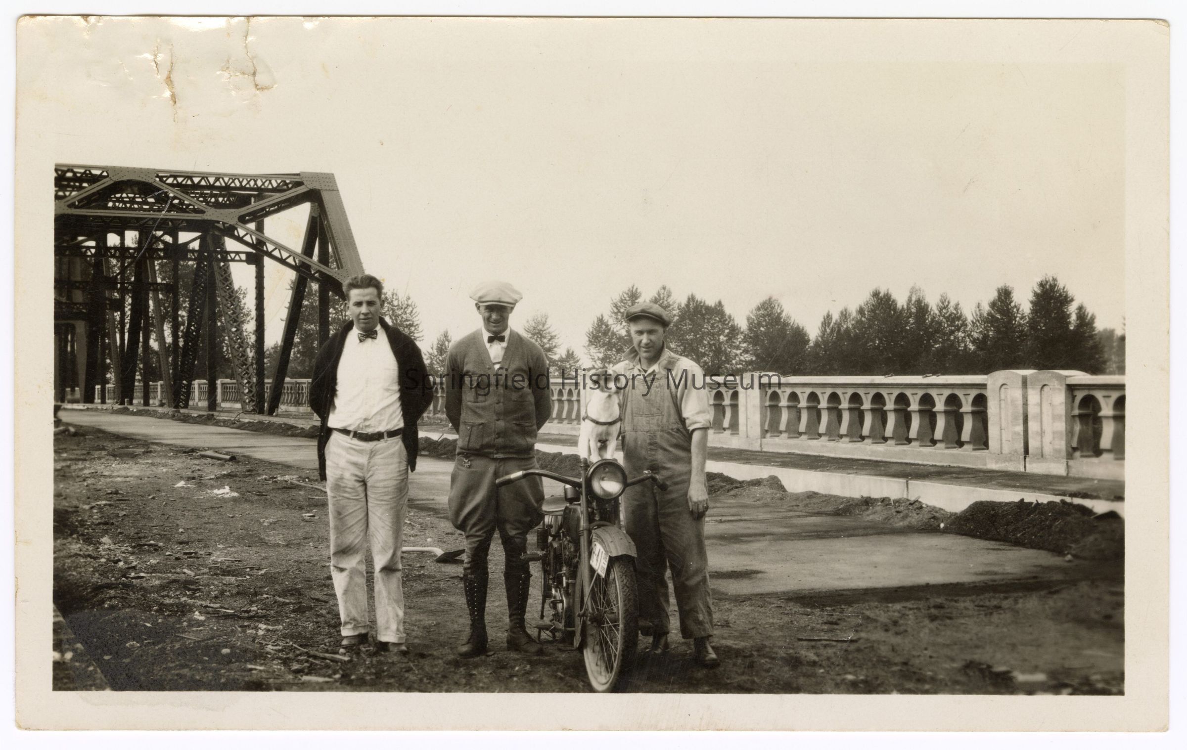Photograph of Bill Davis, two other men, a dog and his motorcycle, at the new bridge in Springfield, undated, 1926; Inscription back: “reg 69866”Photograph Details