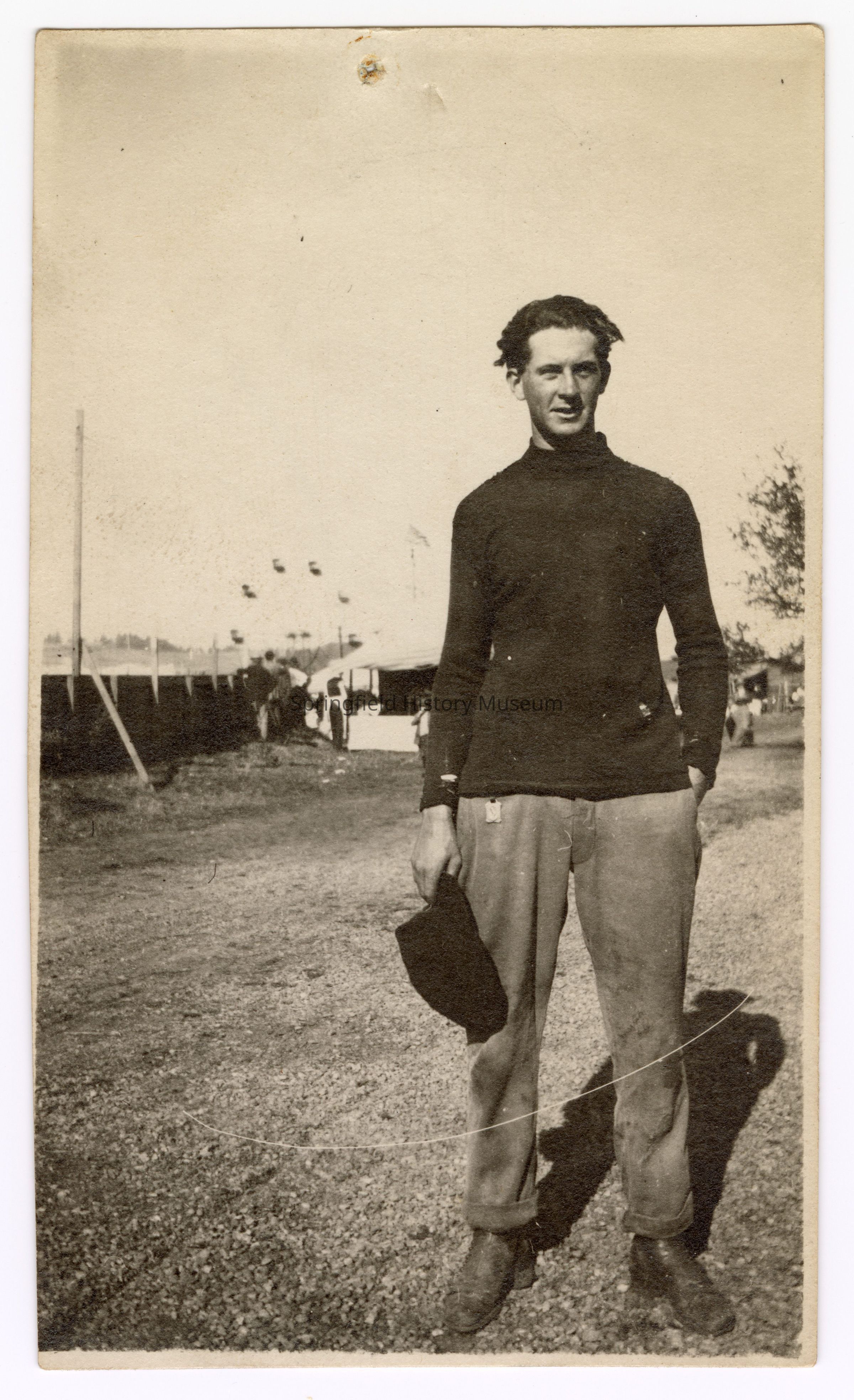 Photograph of Bill Davis at a fair, undated; Inscription back: ‘4’