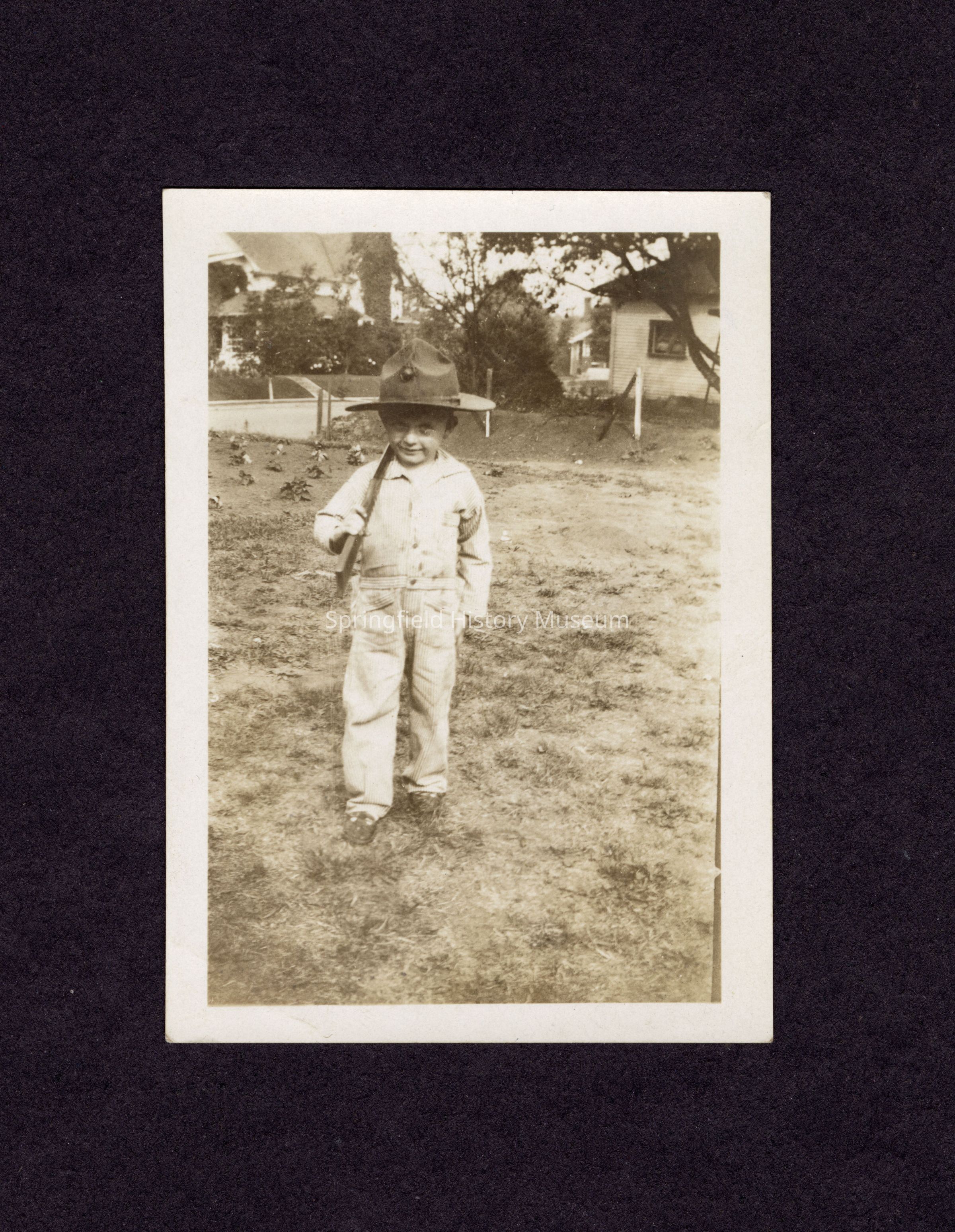 Photograph of Bill Davis Jr. wearing his father's Marines hat. Father, Bill Davis Sr. was Chief of Springfield Police. Photograph taken at home in Springfield.