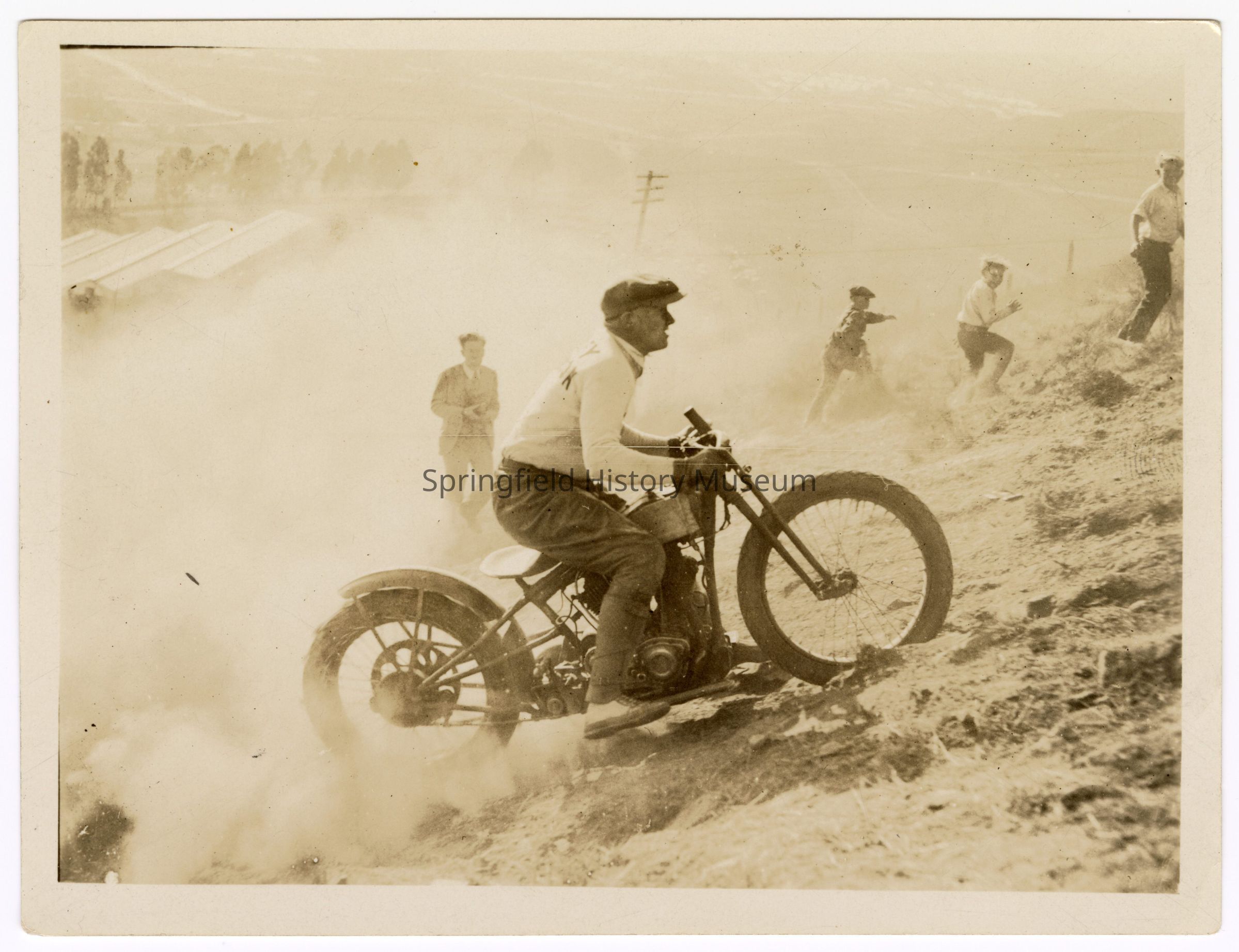 Photograph of Bill Davis on a motorcycle hill climb, undated, circa 1930