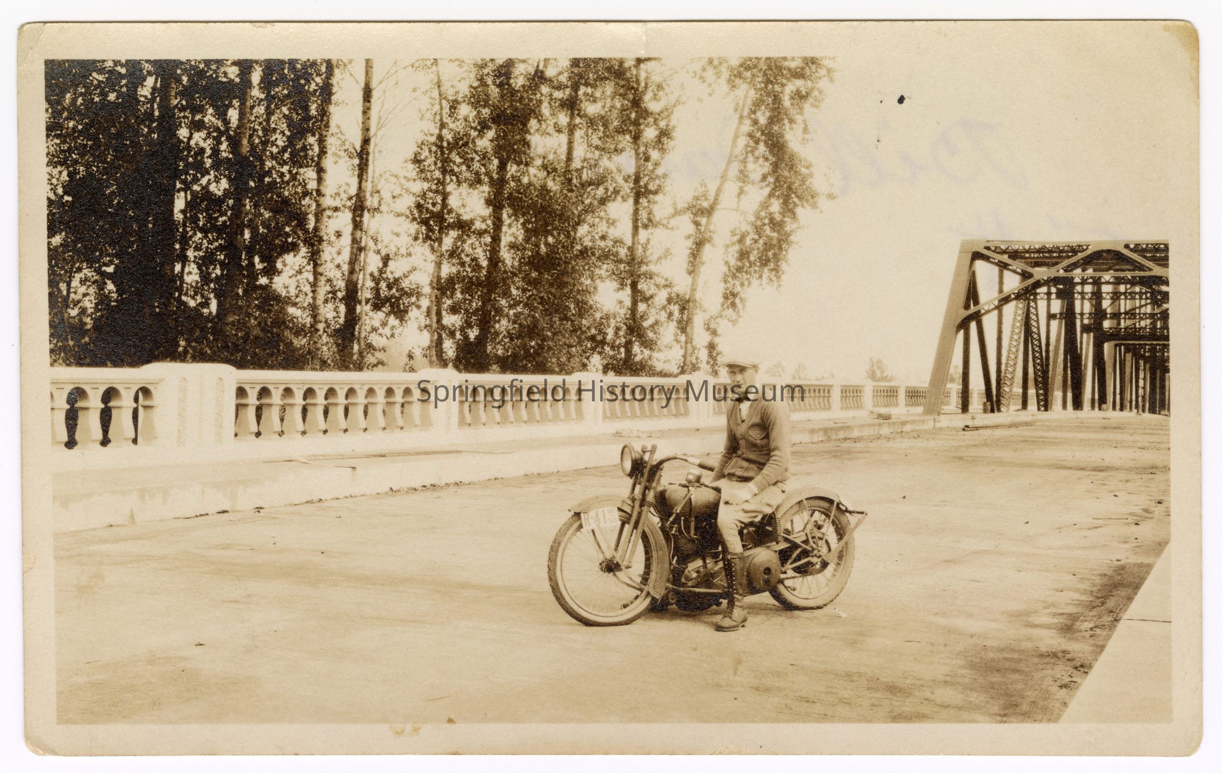 Photograph of Bill Davis on his motorcycle, at a bridge in Springfield, 1926Entry/Object ID