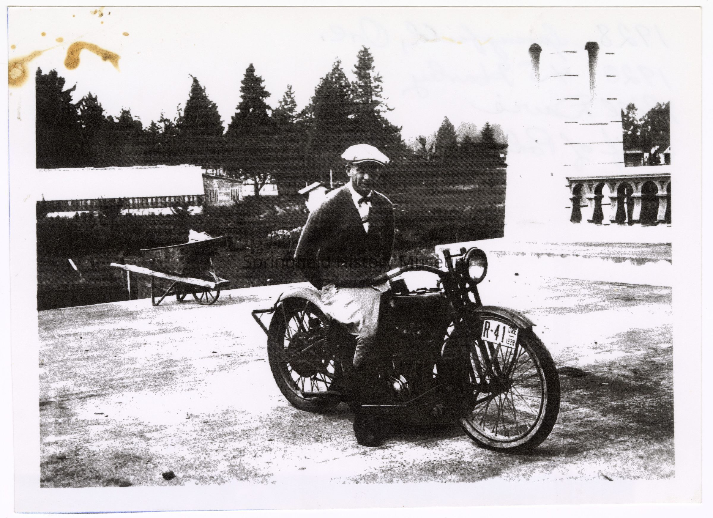 Photograph of Bill Davis on his motorcycle, bridge in Springfield, 1926Entry/Object ID